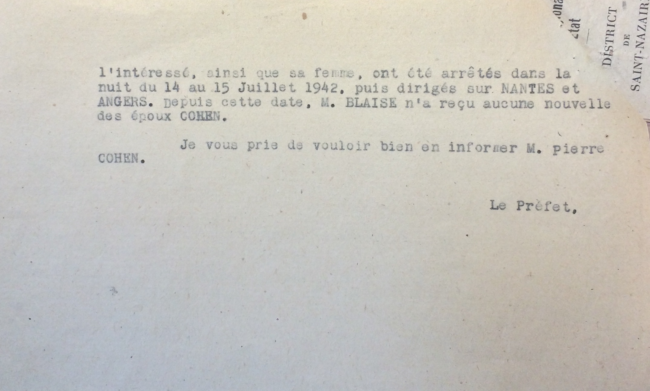 Georges COHEN et son épouse Lucie sont arrêtés dans la nuit du 14 au 15 juillet 1942 à leur domicile par la police allemande, dirigés sur Saint-Nazaire, Nantes puis Angers au Grand Séminaire.