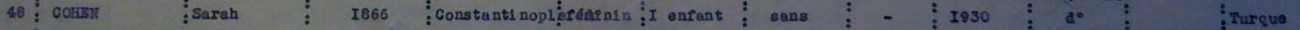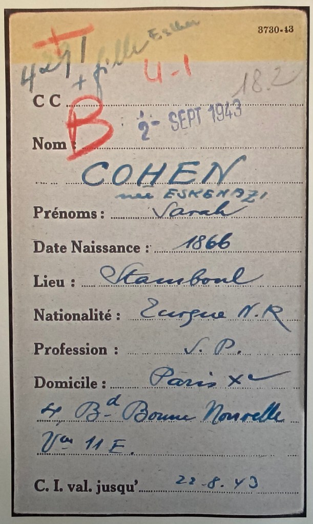 Sarah COHEN (née Eskenazi) est née en 1866 à Constantinople et a onze enfants enfants dont trois identifiés : Esther COHEN née le 16 février 1900 à Constantinople, Rebecca née le 03 janvier 1901 à Constantinople et Jacques né le 19 mai 1889 à Constantinople. Son mari Salomon est décédé en 1937. Elle habite à Paris dans le 10ème arrondissement 4, boulevard de Bonne Nouvelle dans le même immeuble que la famille RODITI avec sa fille Esther, célibataire.