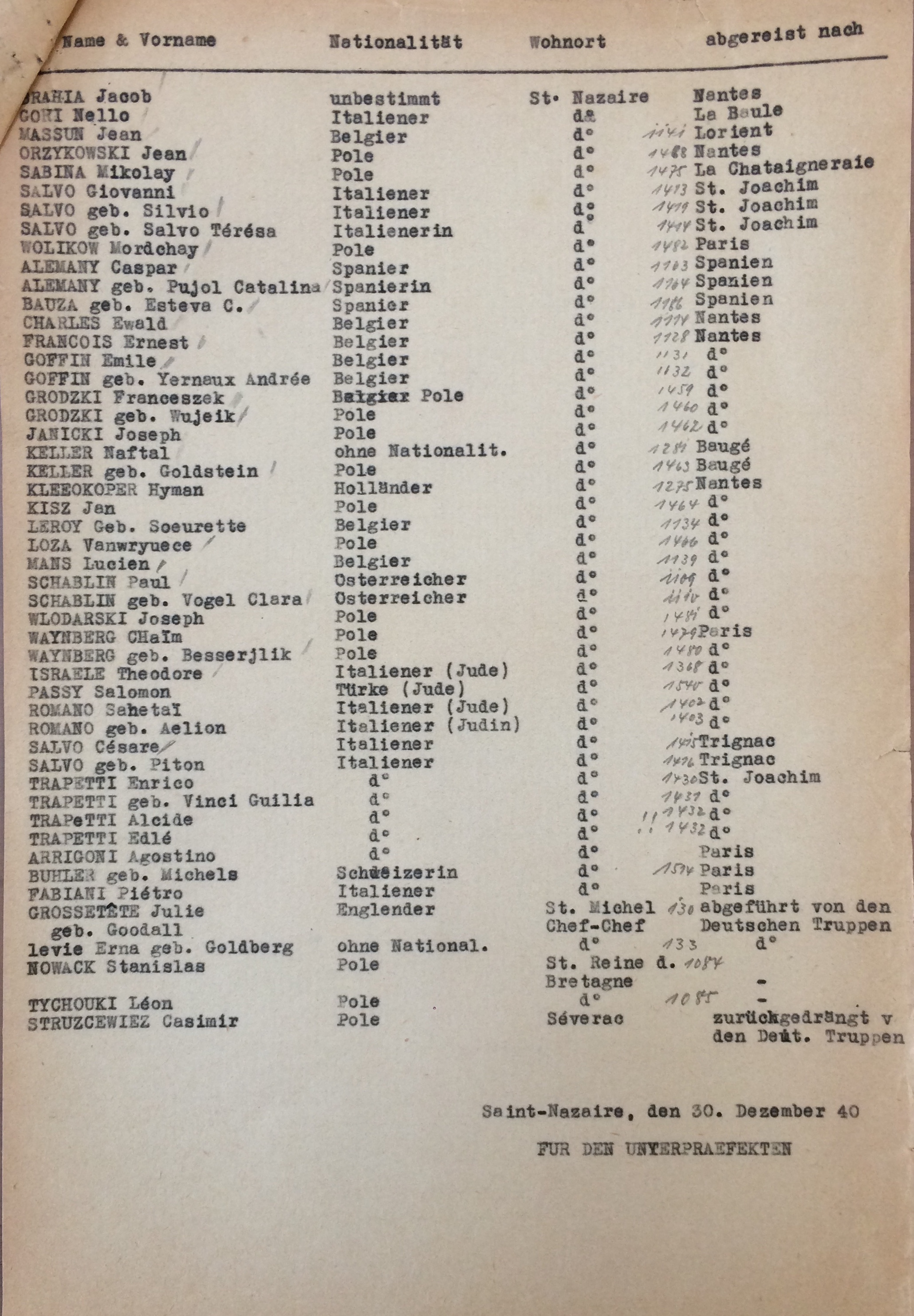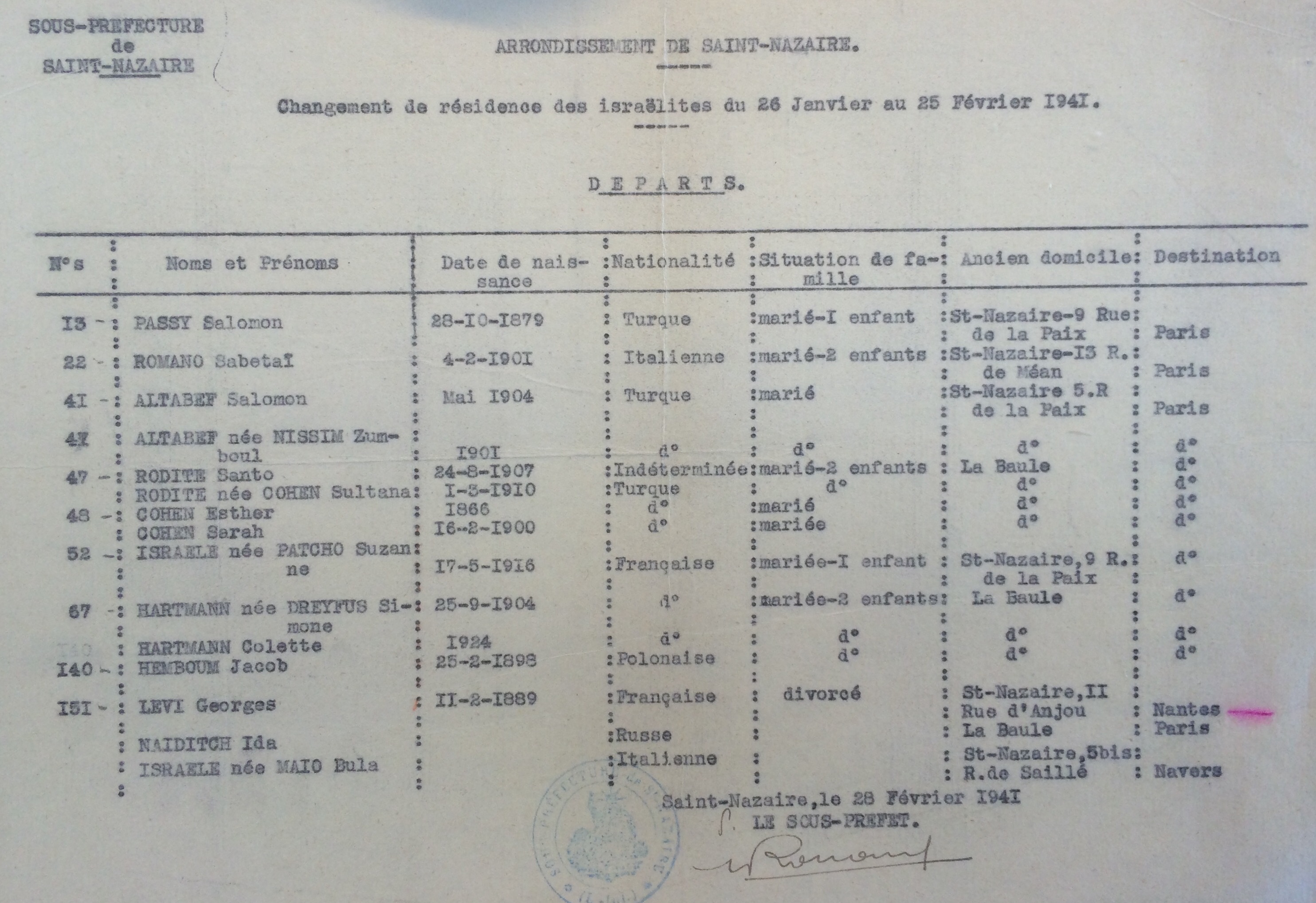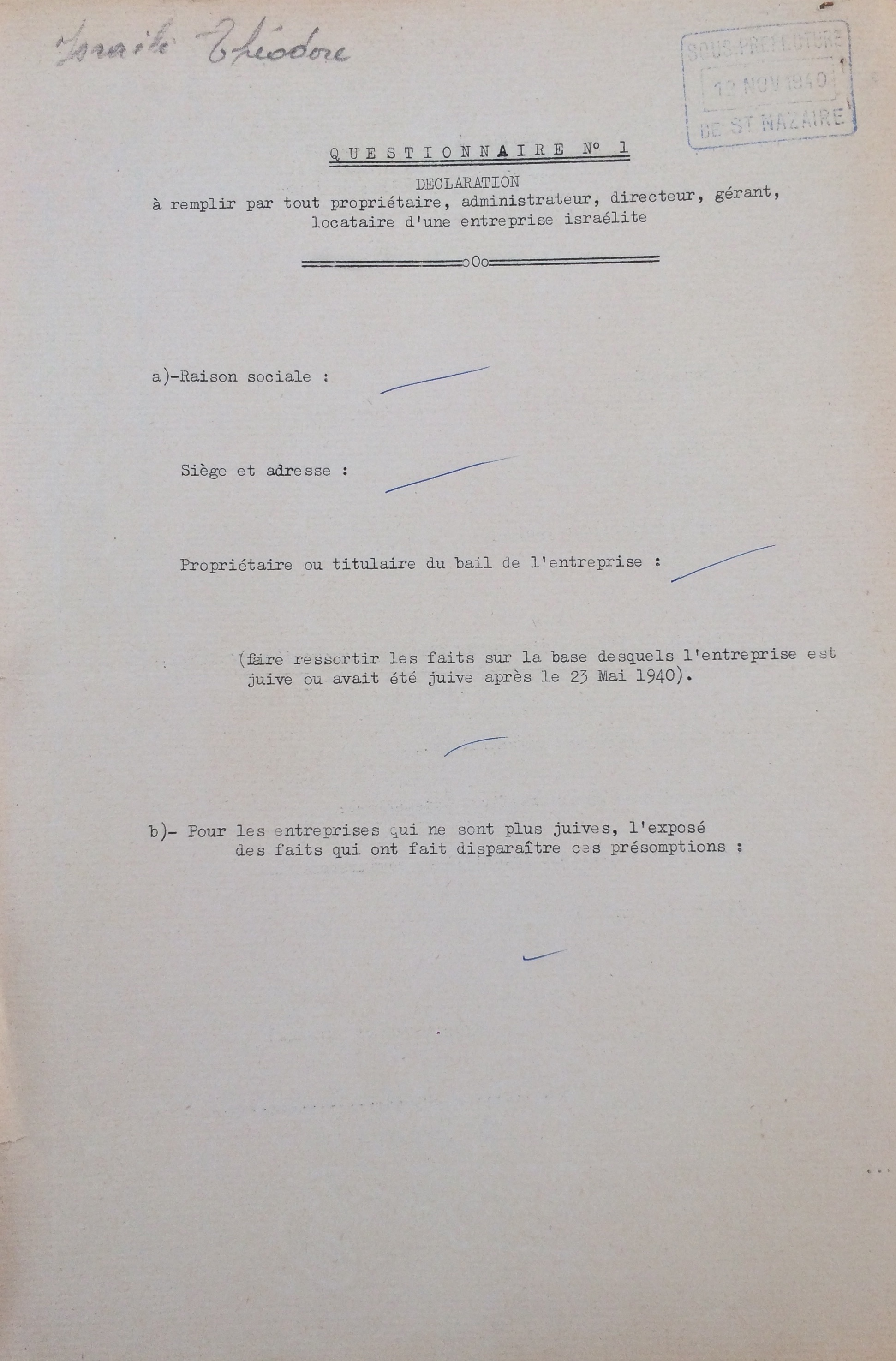 Entre le 27 septembre et le 20 octobre 1940, Théodore est recensé auprès de la sous-préfecture de Saint-Nazaire sous le numéro 52.