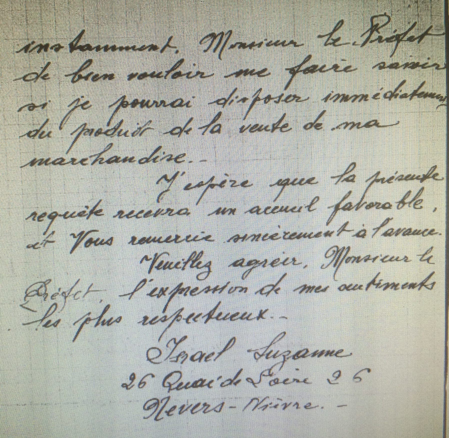 Suzanne ISRAEL apprenant la vente et se trouvant sans ressources réclame auprès du Préfet le produit de la vente. cette lettre restera sans réponse.