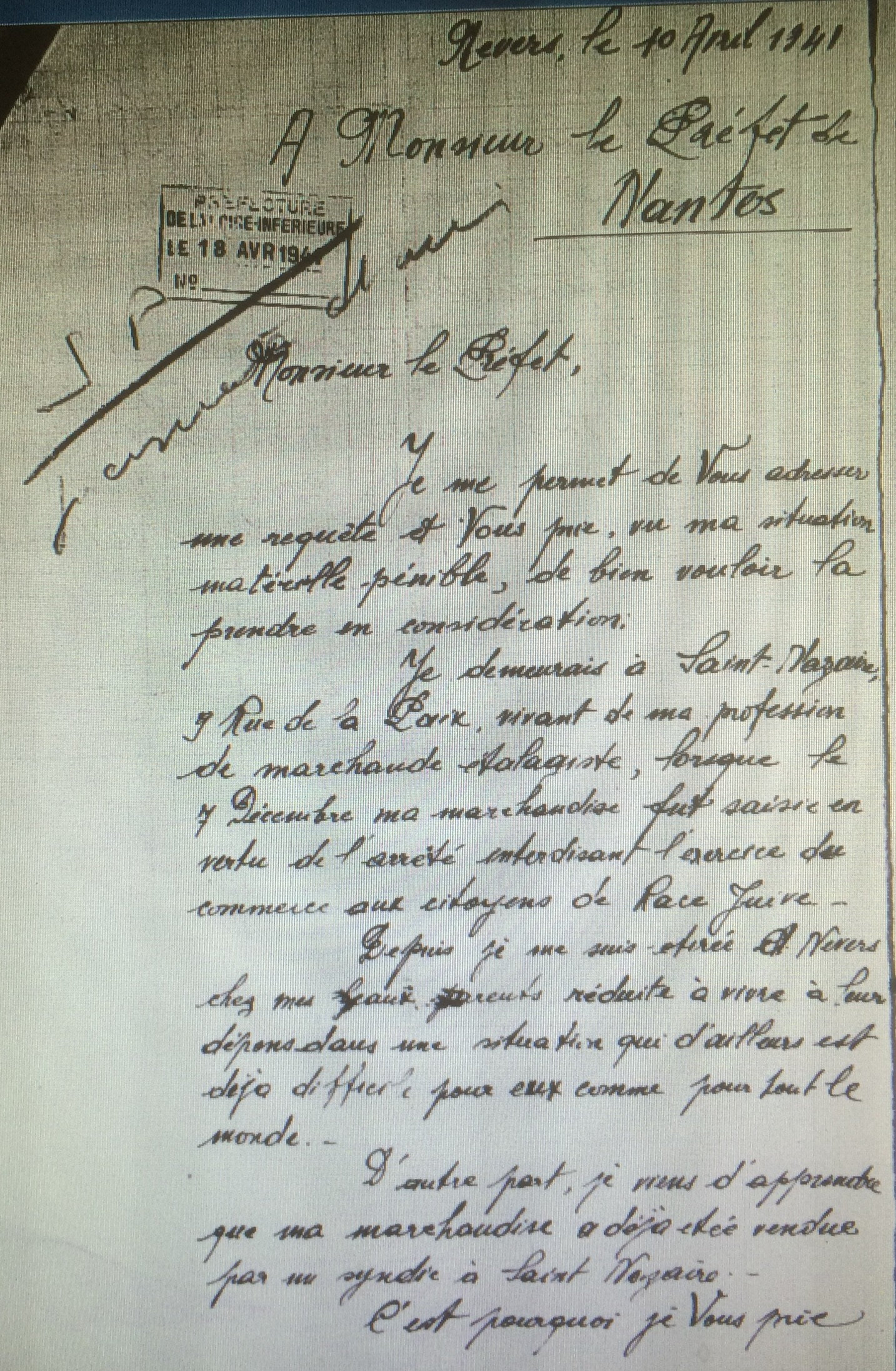 Lettre de Suzanne ISRAËL au Préfet de Loire-Inférieure 10 avril 1941 [AN AJ38/4598 dossier n°2534]