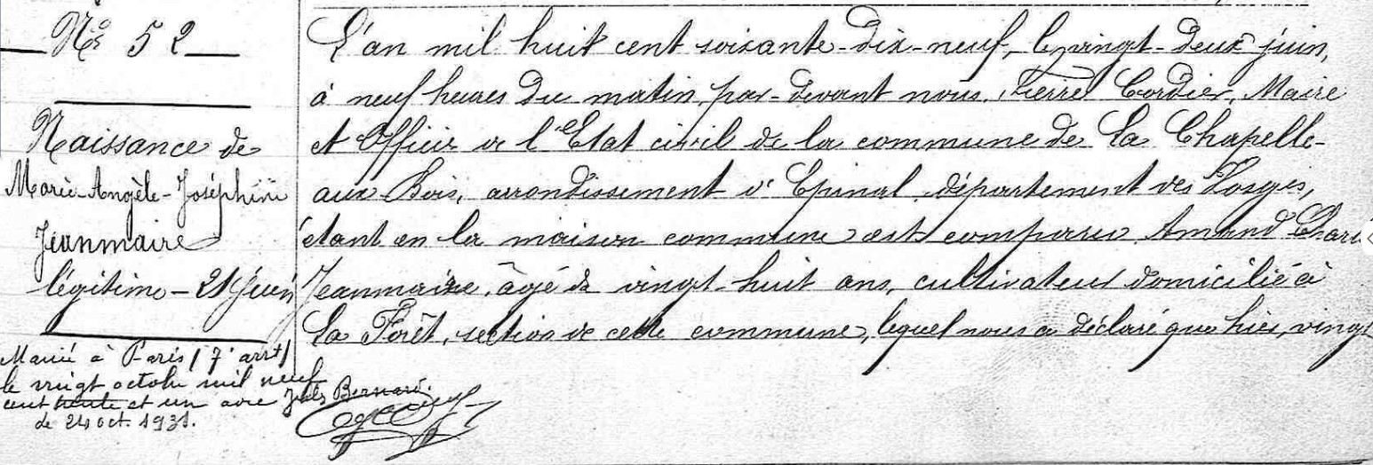Etat civil de Jules BERNARD et Marie-Angèle JEANMAIRE [Archives Mairie de Paris, Archives Départementales des Vosges, Archives Départementales de la Moselle, en ligne]