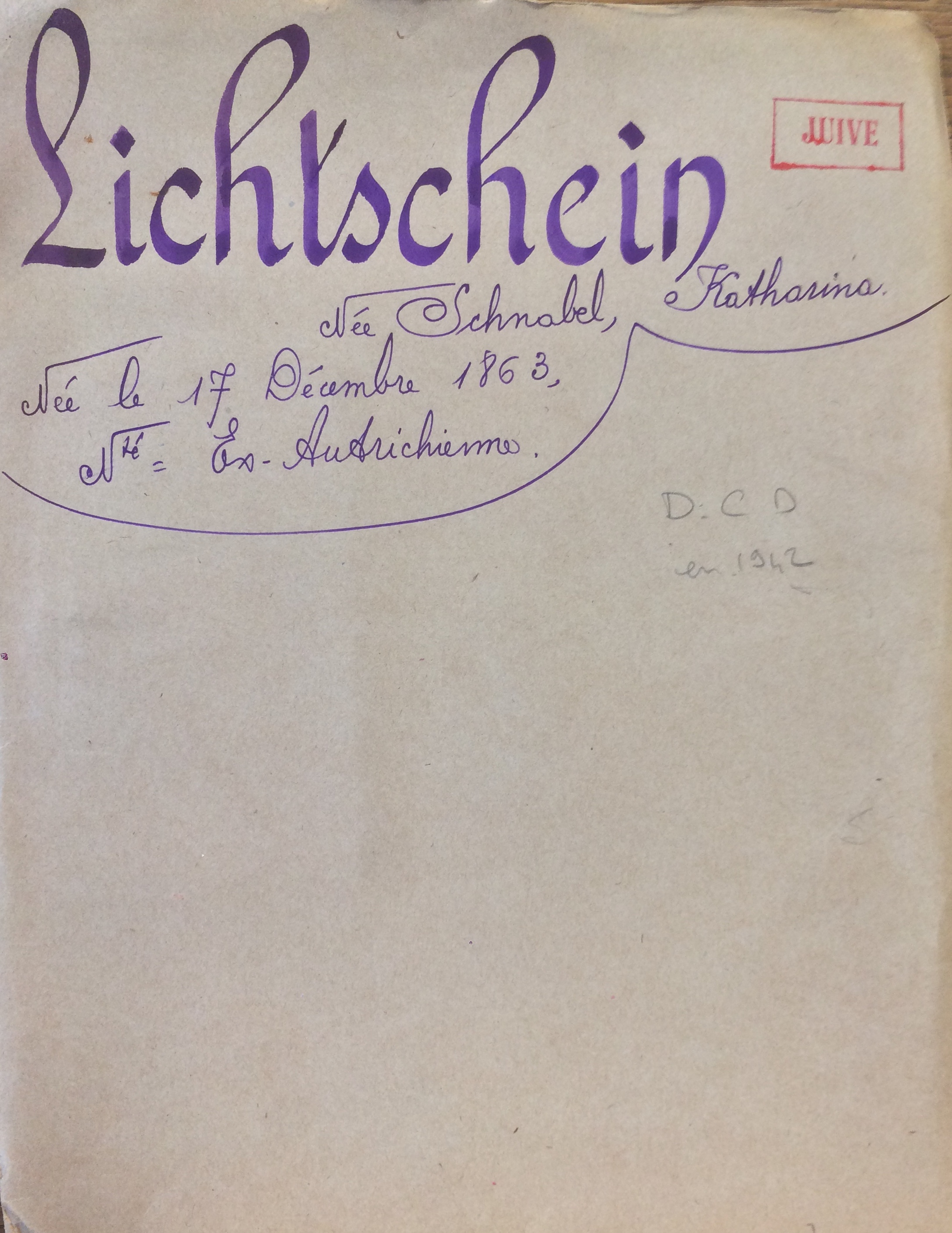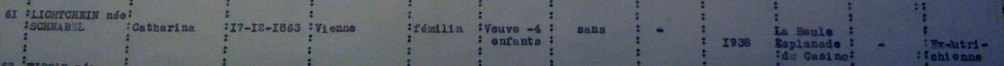 Katarina LICHTSCHEIN née SCHNABEL [Père : Simon SCHNABEL et mère : Henriette SPITZER] est née le 17 décembre 1863 à Vienne, veuve avec 4 enfants (Margit DELMAR née LICHTSCHEIN, Lisa REITLER née LICHTSCHEIN, Robert LICHTSCHEIN et Hilda TIBOLD née LICHTSCHEIN). C’est donc âgée de 77 ans que Katharina se réfugie à La Baule (avec deux de ses enfants, Margit et Hilda). Tout le monde réside Esplanade du Casino à La Baule. Elle est arrivée en France en 1938 et est d’origine ex-autrichienne.