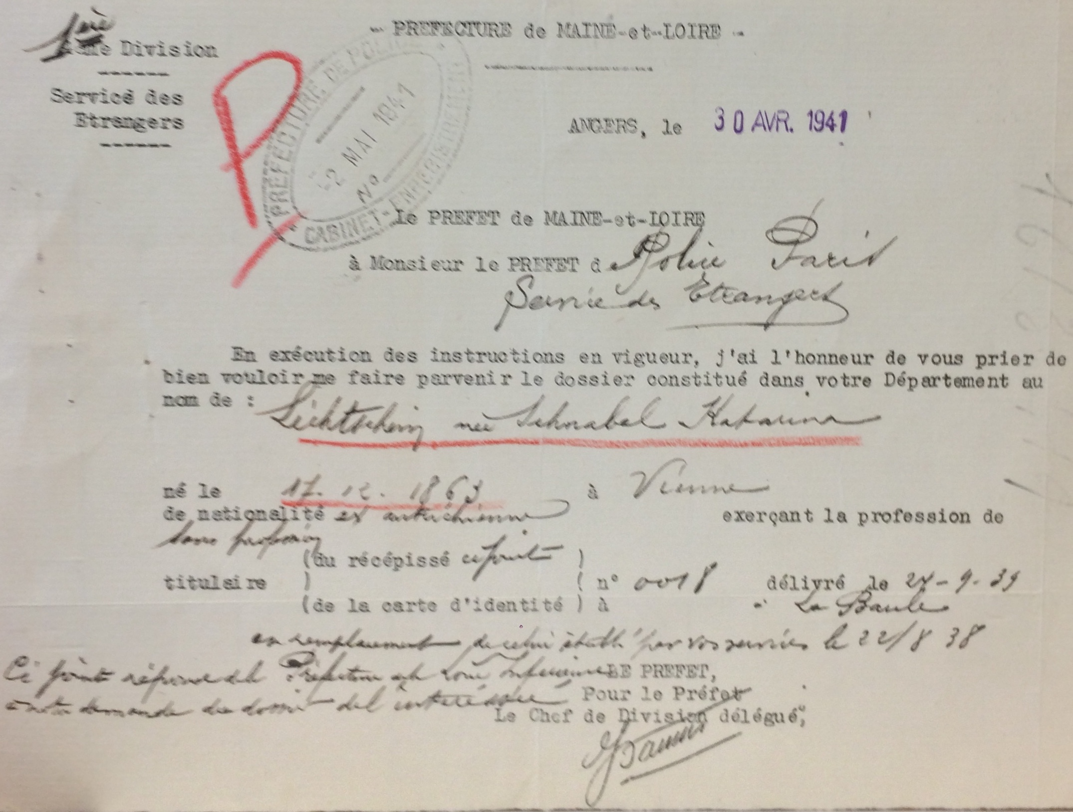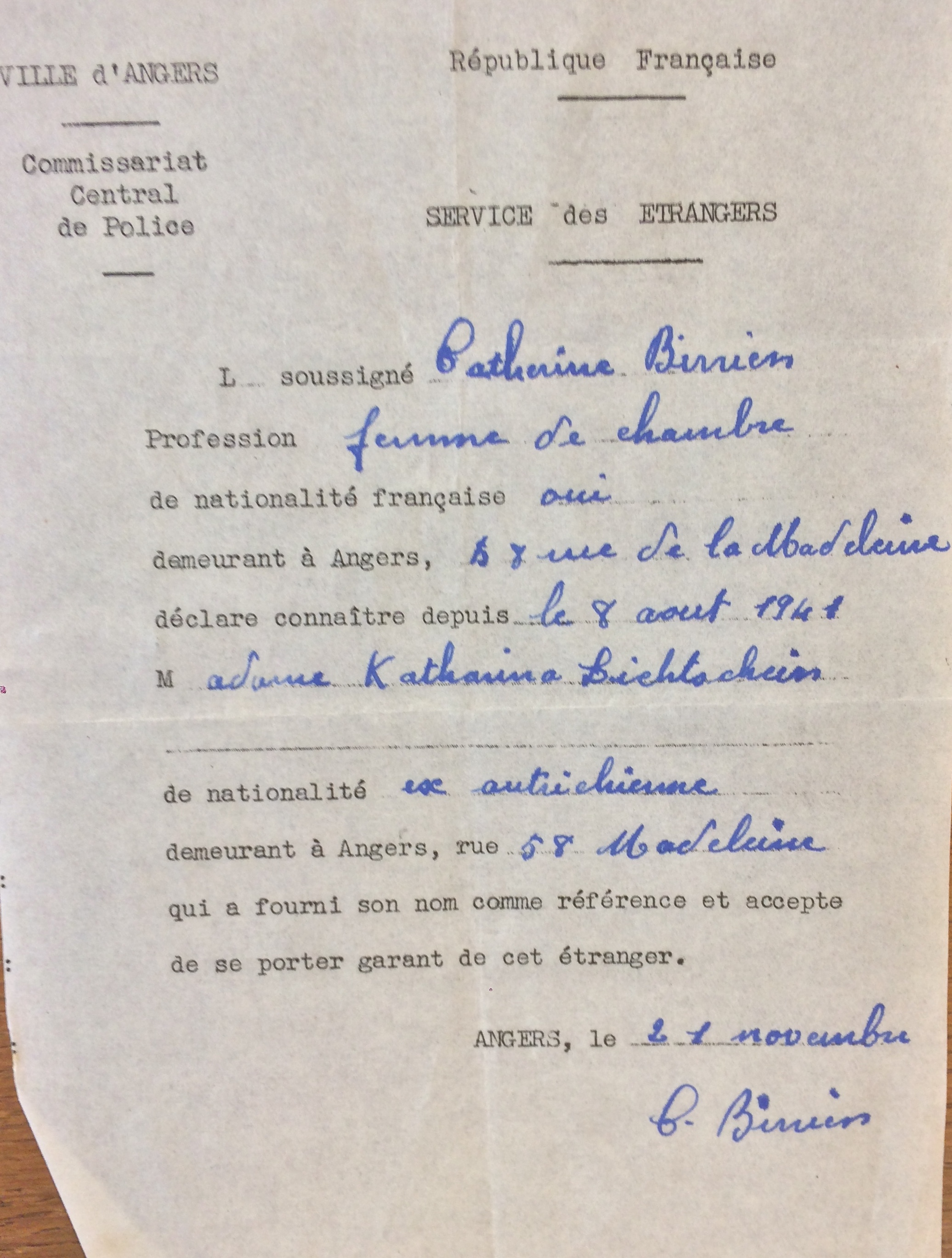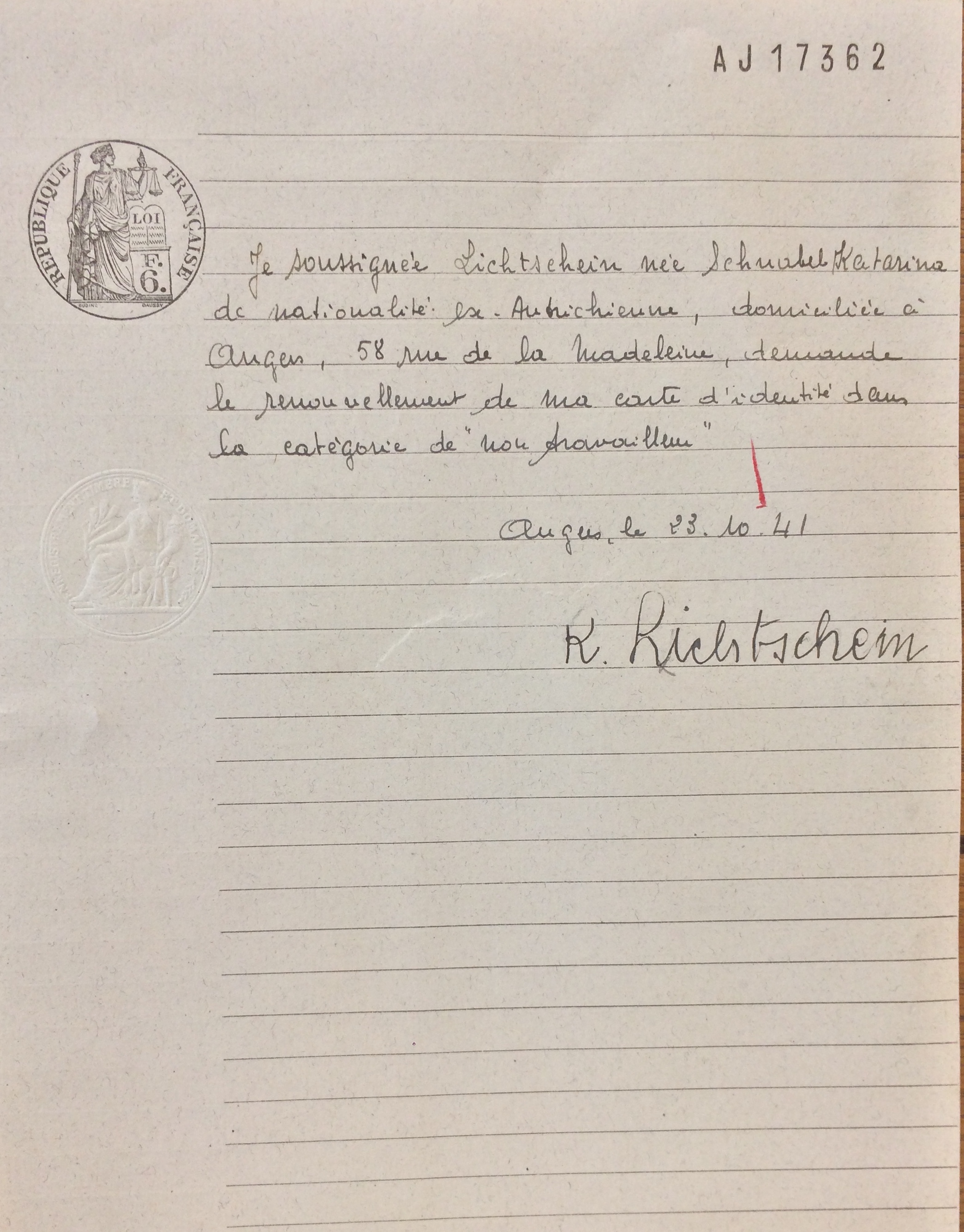 Katharina se fait recenser auprès du commissariat de La Baule (ou auprès de la sous-préfecture de Saint-Nazaire) entre le 27 septembre et le 20 octobre 1940 sous le numéro 61.