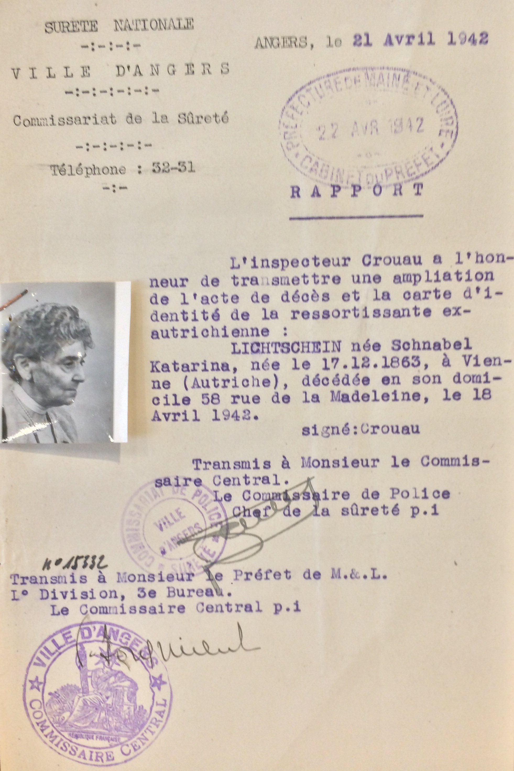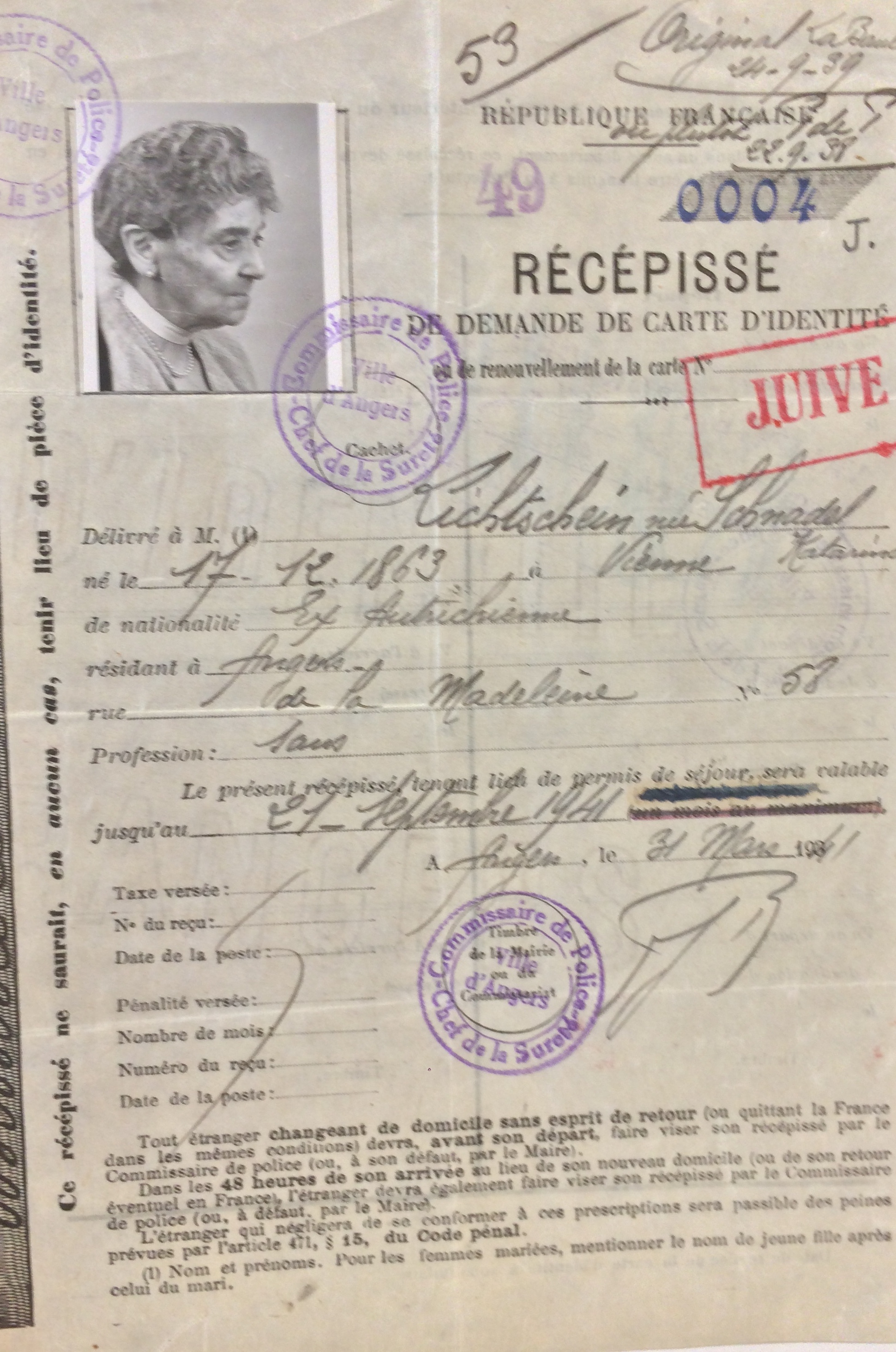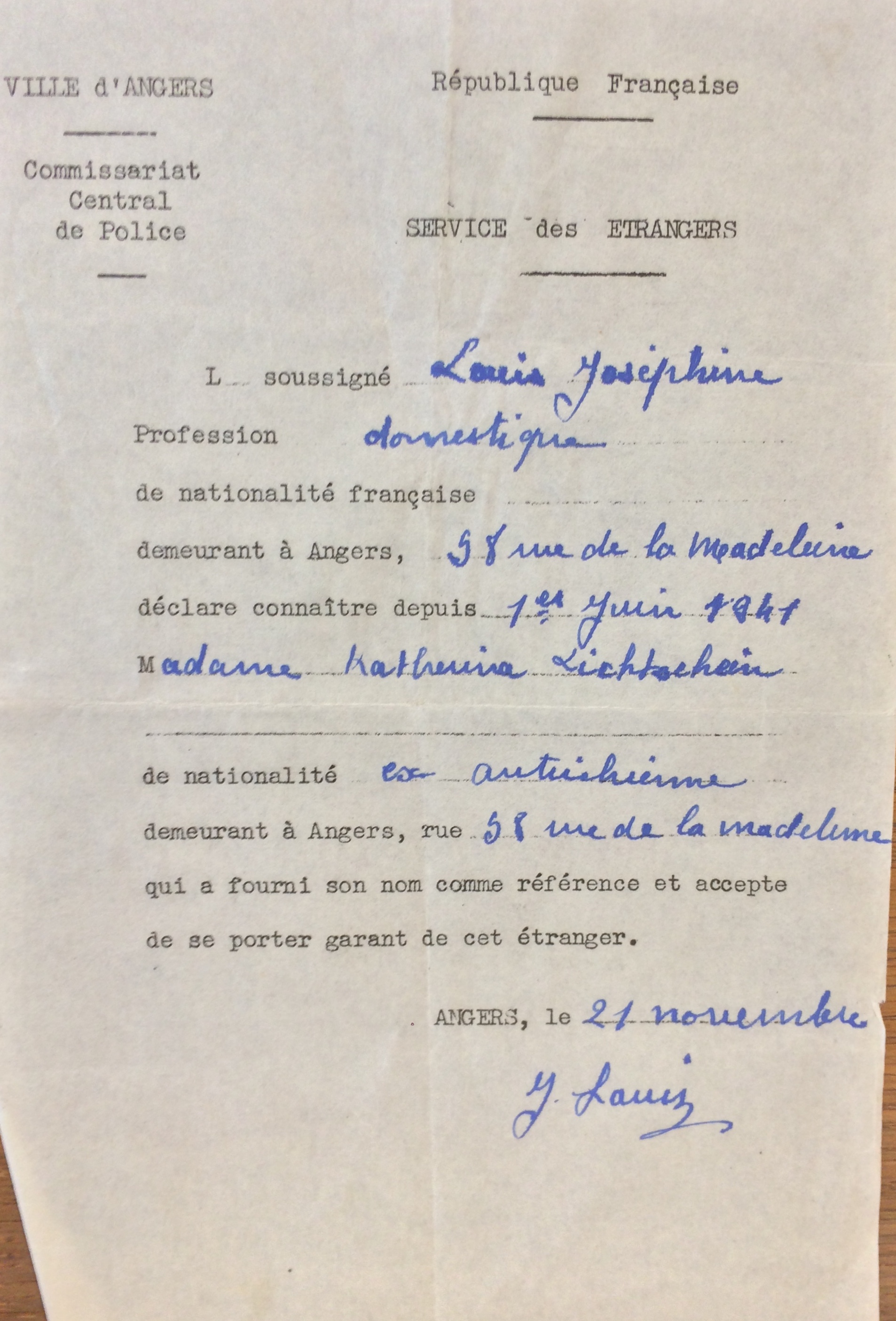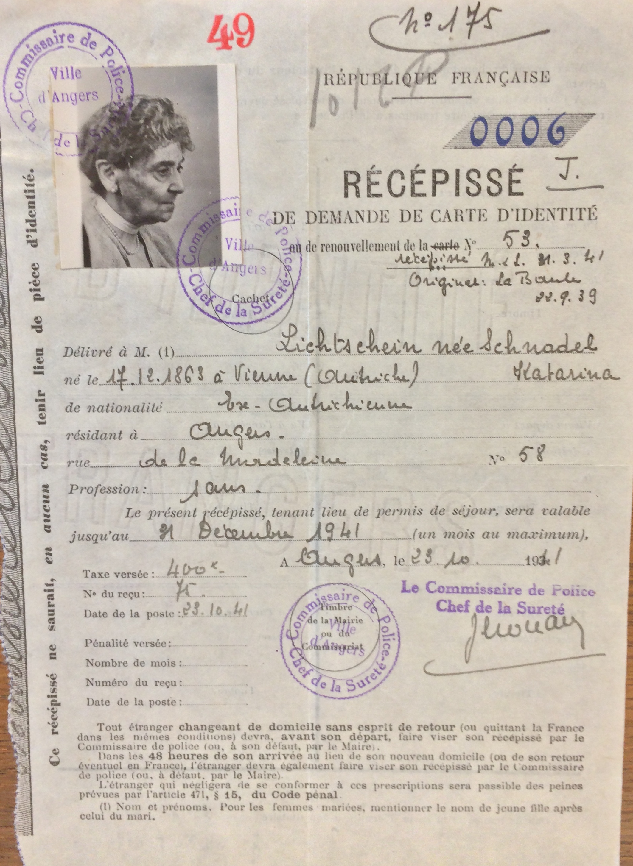 Katharina se fait recenser auprès du commissariat de La Baule (ou auprès de la sous-préfecture de Saint-Nazaire) entre le 27 septembre et le 20 octobre 1940 sous le numéro 61.