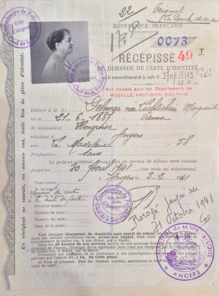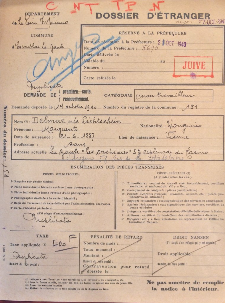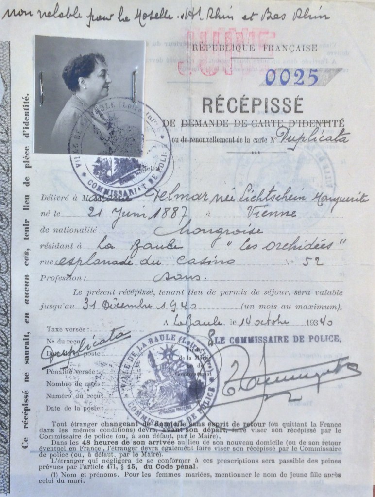 Margit ou Marguerite DELMAR est née le 21 juin 1887 à Vienne (Père : Paul LICHTSCHEIN et Mère : Katharina LICHTSCHEIN), mariée depuis le 18 juillet 1912 avec Bela Bernhard DELMAR né le 5 janvier 1880 à Lukino Selo (actuelle Serbie), 1 enfant et d’origine ex-autrichienne de nationalité hongroise lorsqu’elle arrive en France le 03 mars 1938 où elle se fait faire une carte d’identité auprès des services de la Préfecture de Police de paris puis se réfugie avec sa mère et sa soeur (Hilda TIBOLD) à La Baule, Villa Les Orchidées au 52 Esplanade du casino.
