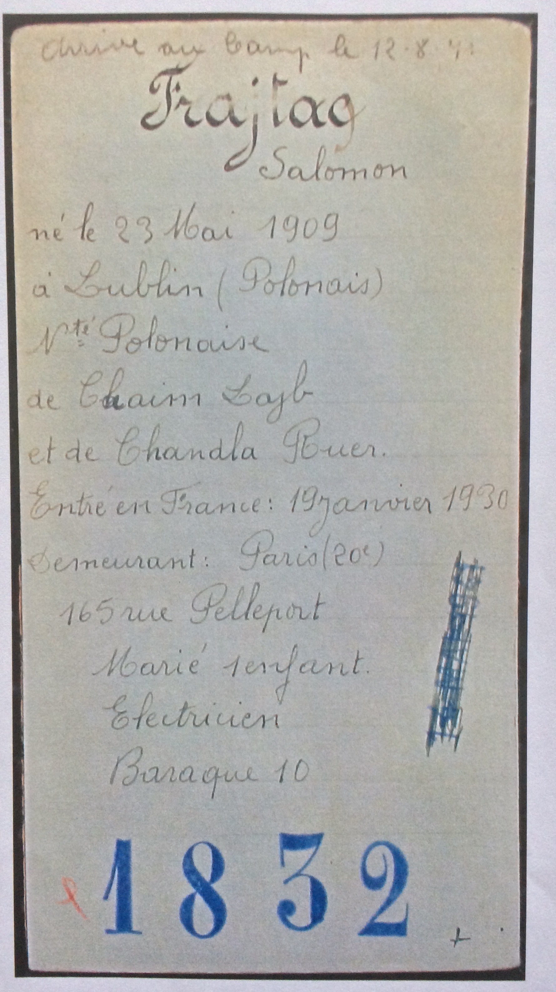 Salomon FRAJTAG a été convoqué à 9 heures du matin le 23 juillet 1941 à la Préfecture de Police de Paris pour soit-disant vérifier l’autorisation d’exercer son métier d’électricien puis est revenu le soir vers 17 heures chez lui avec deux policiers en civil pour y récupérer des affaires. Il est incarcéré à la prison des Tourelles pendant 1 mois environ et interné dans le camp de Pithiviers (baraque 10) le 12 août 1941.