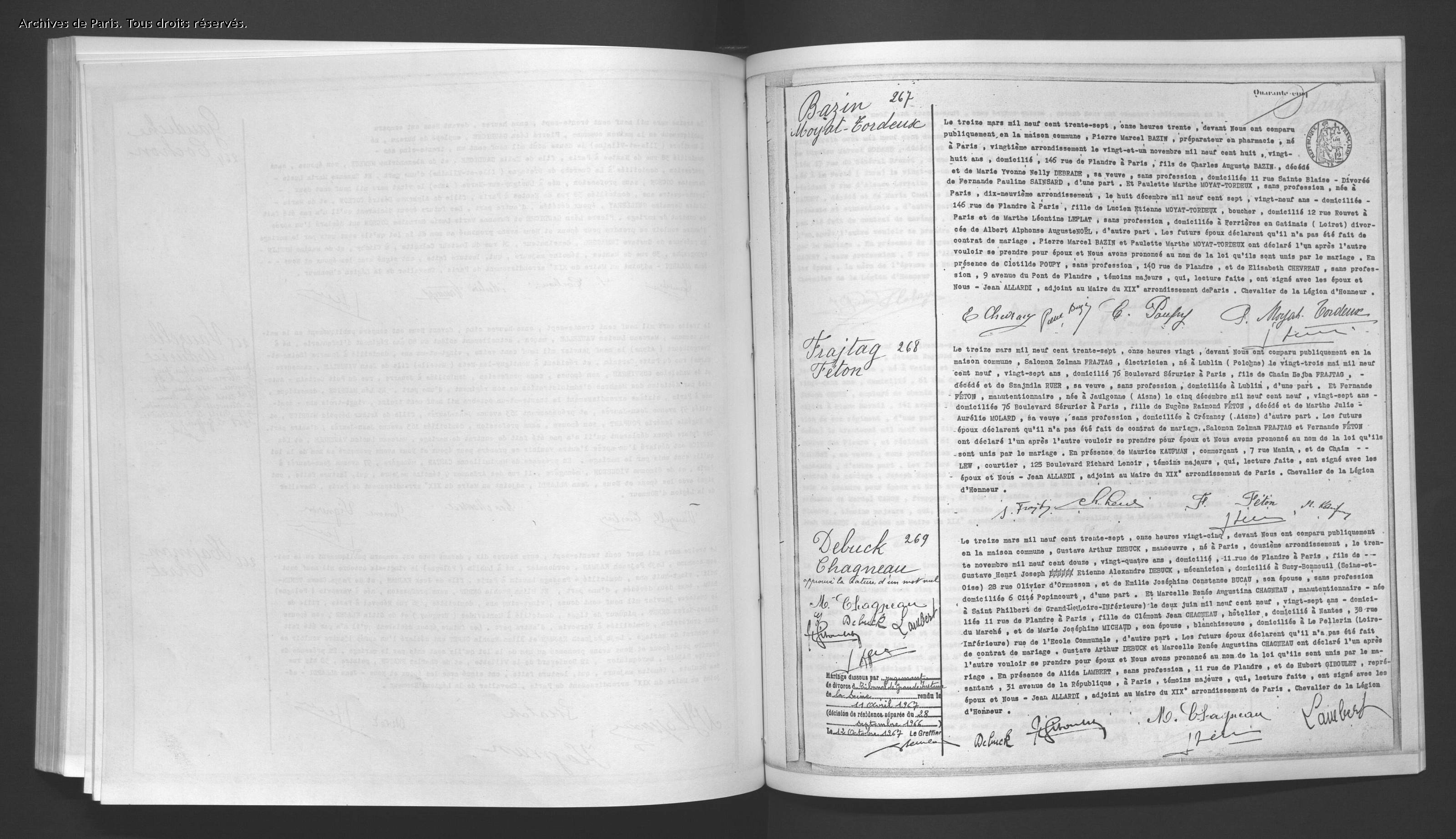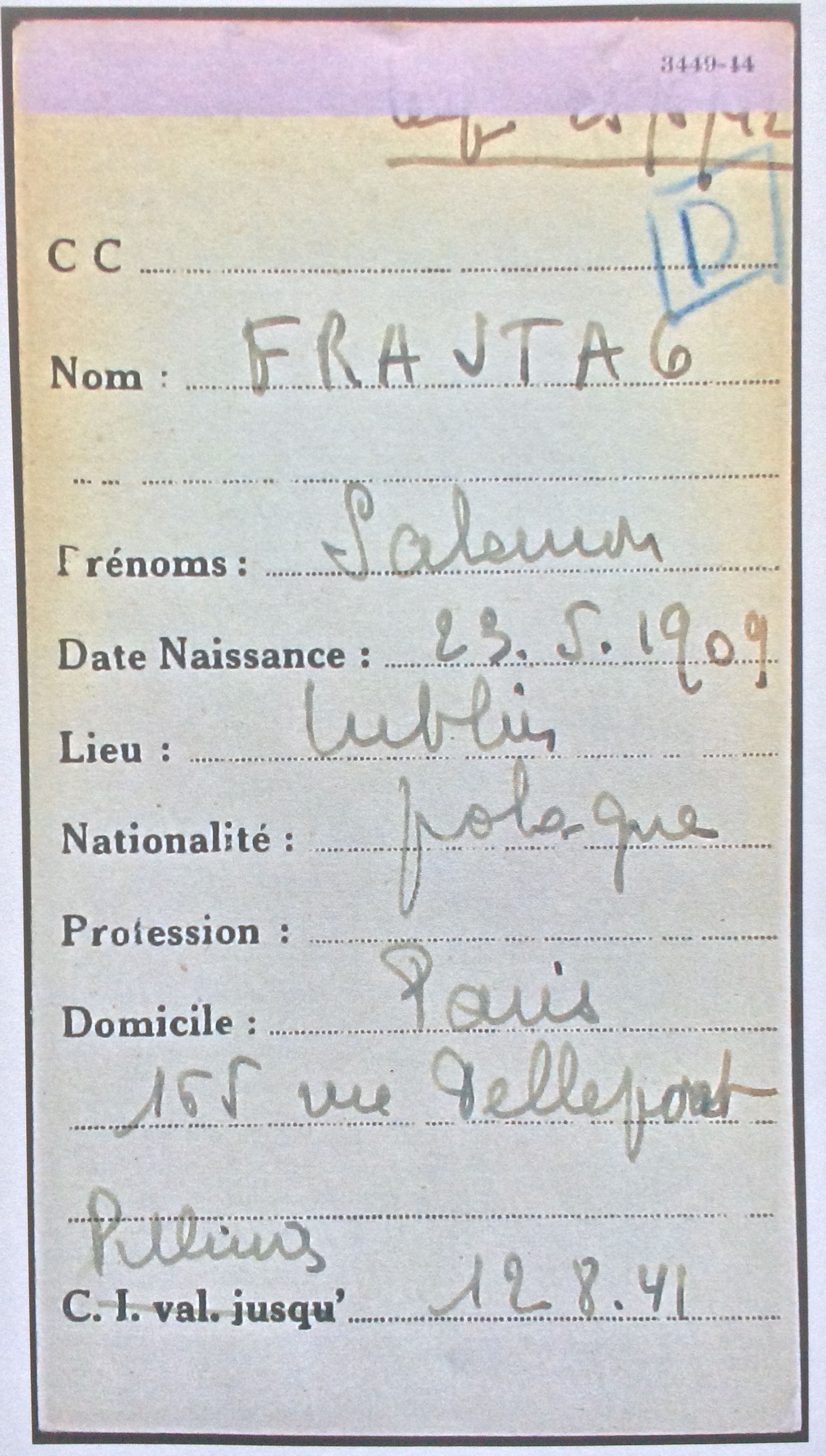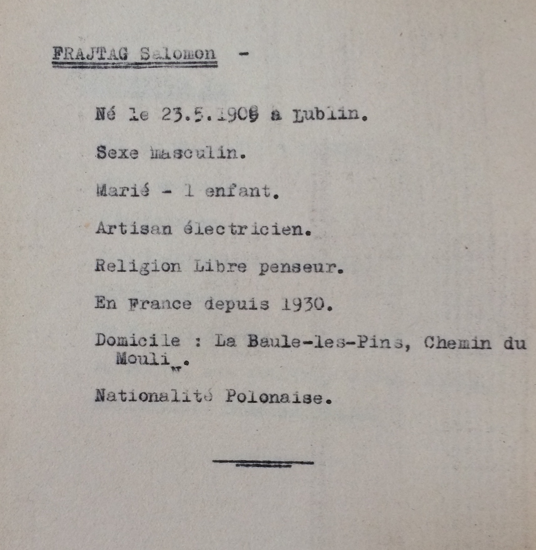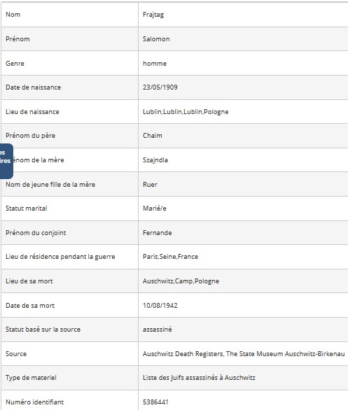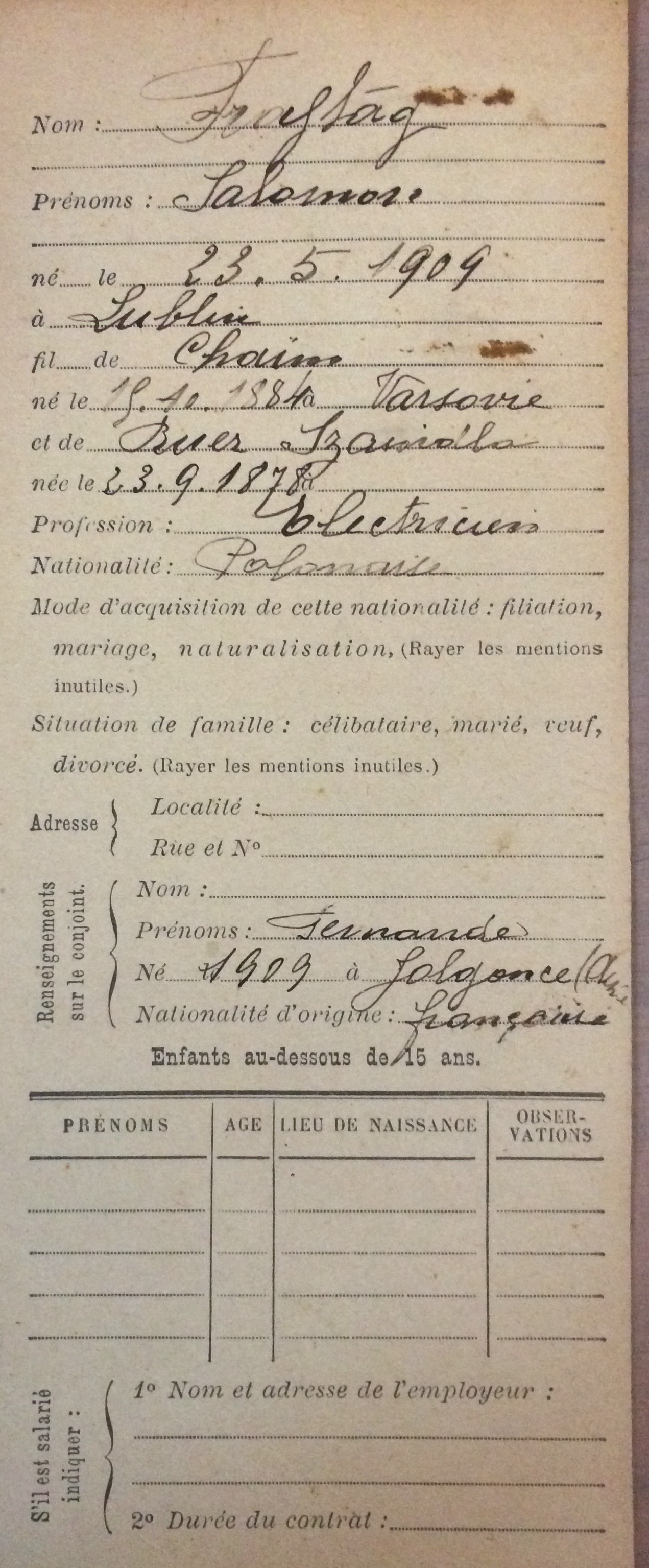 Salomon Zelman (prénom usuel Salomon) FRAJTAG est né le 23 mai 1909 à Lublin (Pologne) [Père FRAJTAG Chaïm Lejb et Mère : RUER Szajndla] et est arrivé en France à l’âge de 21 ans en 1930. Il est marié avec Fernande FETON née à Jaulgonne (Aisne) le 06 décembre 1909. Ils se sont mariés le 13 mars 1937 à Paris (19ème arrondissement). Le couple a un enfant : Monique née le 04 octobre 1938 à Paris (19ème arrondissement). Salomon exerce la profession d’électricien tandis que son épouse au moment du mariage exerce la profession de manutentionnaire.