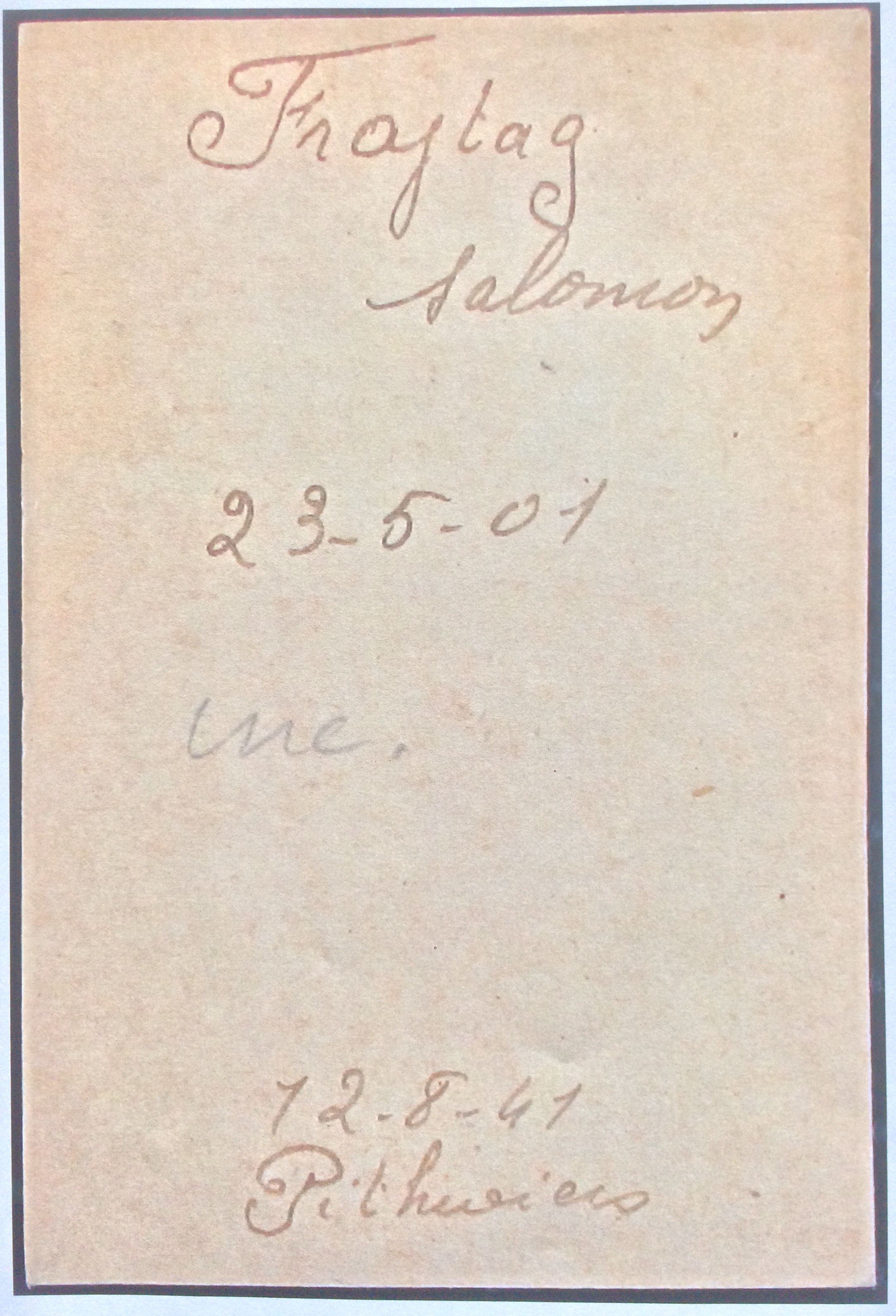Salomon est enregistré dans le camp d’Auschwitz sous le matricule n°42015 et décède le 10 août 1942, moins de deux mois après son arrivée au camp. Salomon avait 33 ans.