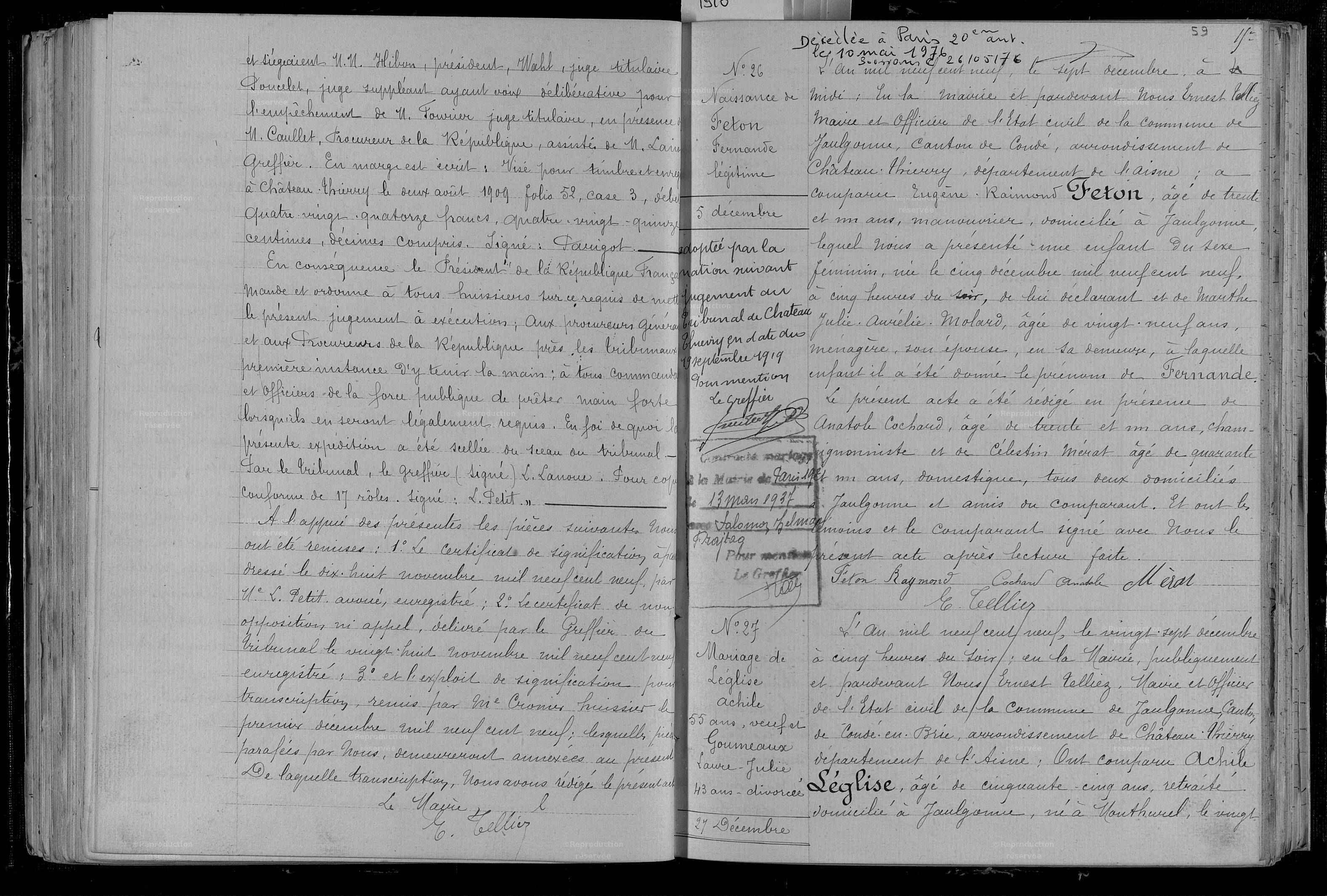 Acte de naissance de Fernande FETON [Archives départementales de l’Aisne 1E0481] et acte de mariage [Mairie de Paris, 19M347]