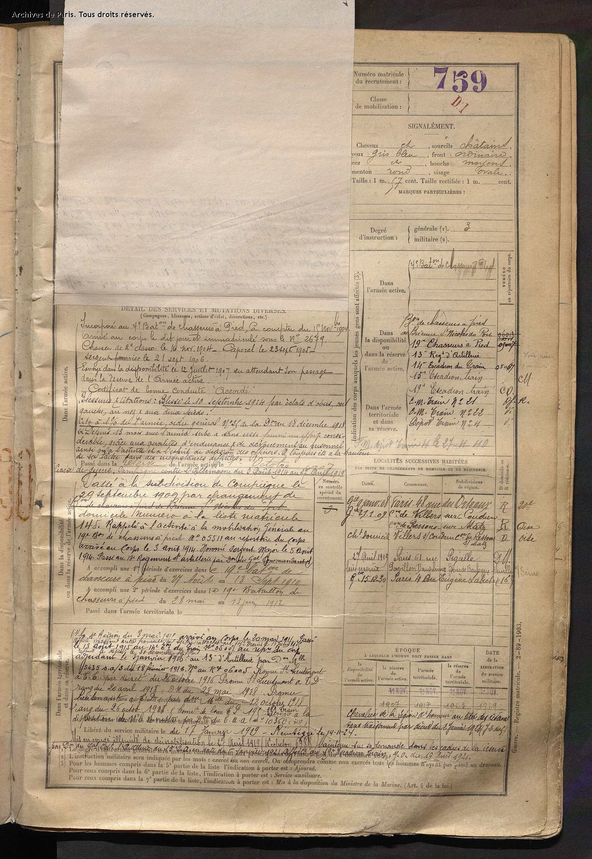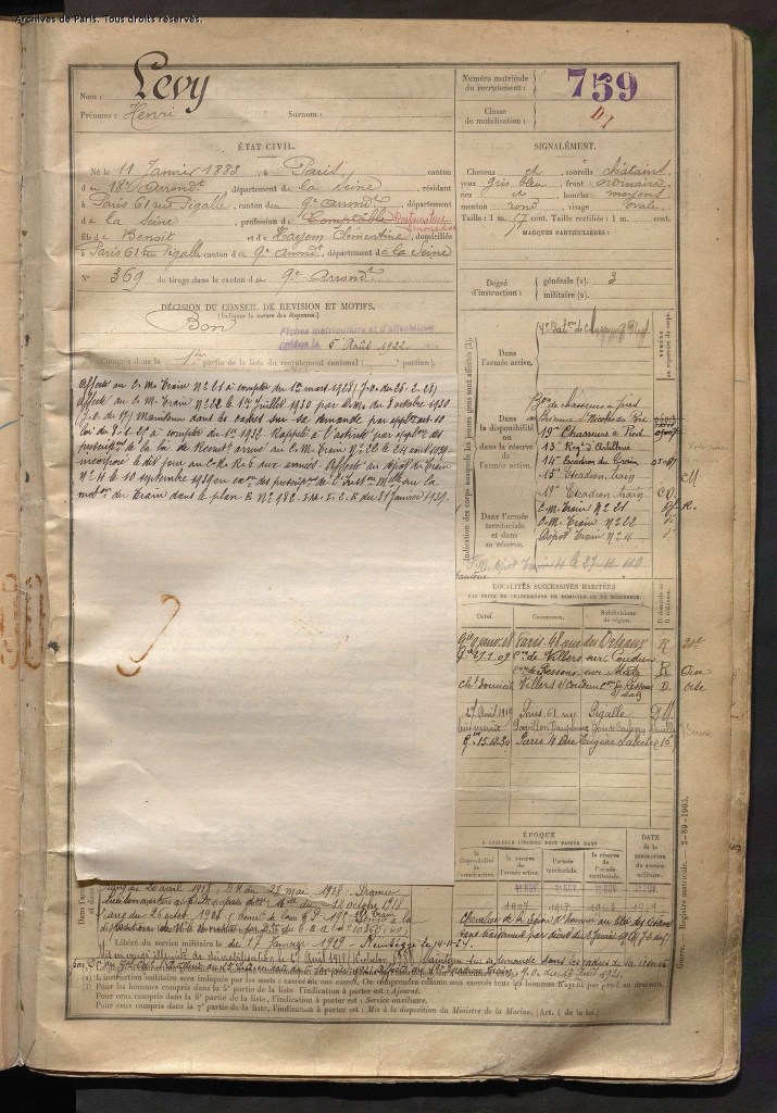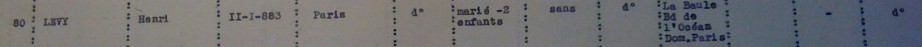 Henri LEVY est né le 11 janvier 1883 à Paris (20ème arrondissement) [Père : LEVY Benoît, marchand de nouveautés et Mère : Clémentine HAYEM, marchande de nouveautés]. Il est marié avec Marcelle PICARD née le 13 novembre 1887 à Paris (3ème arrondissement) [Père : Alexandre PICARD, tripier et Mère : Mélanie MICHEL, tripière]. Le couple se marie à Paris (20ème arrondissement) le 10 décembre 1907 et a deux enfants. En 1903, il est restaurateur limonadier et réside en 1919 au Pavillon Dauphine près du Bois de Boulogne. Il semblerait donc qu’Henri LEVY a exercé une activité autour de la restauration.