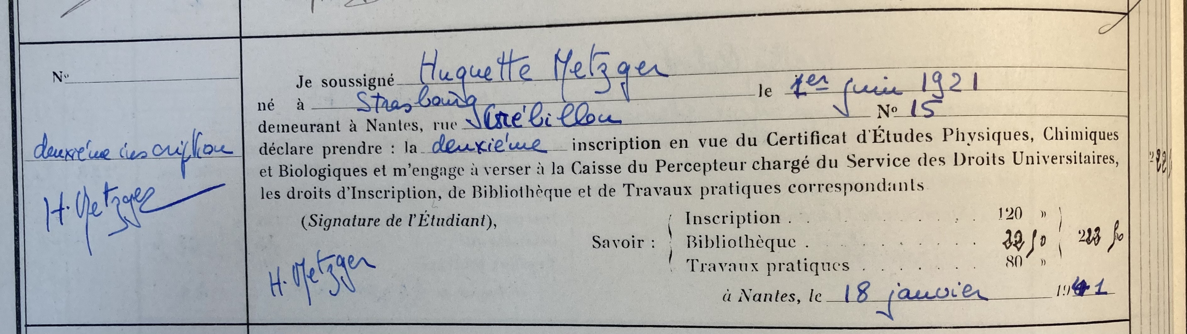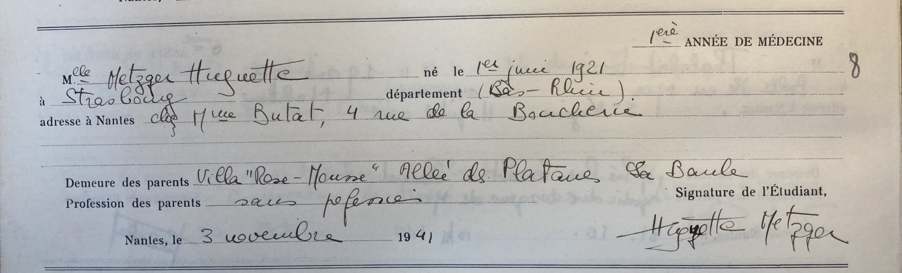 Elle réussit son entrée à la Faculté de Médecine de Nantes et s’inscrit à la faculté. Elle réside alors à Nantes chez Mme BUTAT 4, rue de la Boucherie.