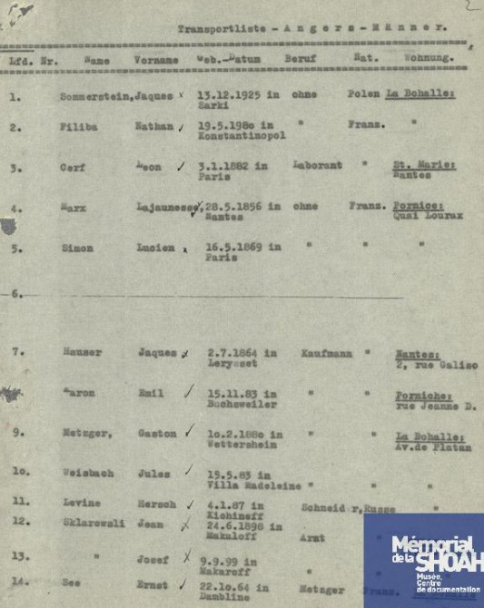 A Angers, le 20 juillet 1942, la liste du convoi est prête afin d’envoyer les 827 hommes, femmes, enfants, personnes âgées en déportation à Auschwitz. Hors, à la mi-juillet 1942, les enfants de moins de 16 ans et les personnes âgées de plus de 55 ans ne sont pas déportables. Hans-Dietrich ERNST, qui était devenu depuis juin 1942 SS-Hauptsturmführer et commandant de la Sûreté et du SD (KdS) à Angers (le SD est l’organe de répression en France chargé de la déportation des Juifs), avait fait reporter sur la liste du convoi numéro 8 tous les internés du Grand Séminaire quel que soit leur âge. 14 hommes et 15 femmes vont descendre à Drancy (raison inconnue) tandis que les enfants de moins de 16 ans (accompagnés d’un adulte, mère ou grand-mère) et les personnes de plus de 55 ans sont dirigés vers le camp de la Lande à Monts près de Tours.