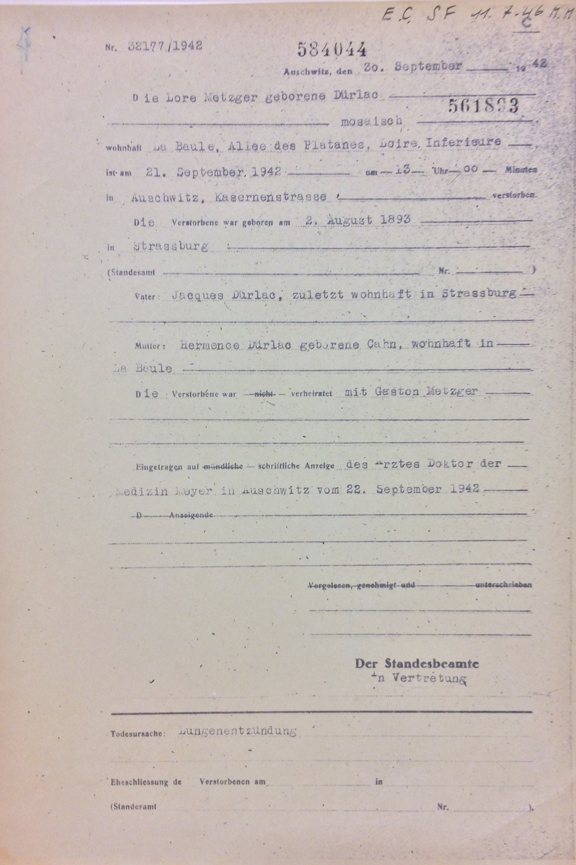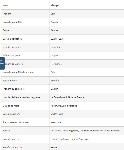 Laure METZGER et sa fille Huguette sont à priori déportées par le convoi numéro 8 d’Angers vers Auschwitz le 20 juillet 1942.
