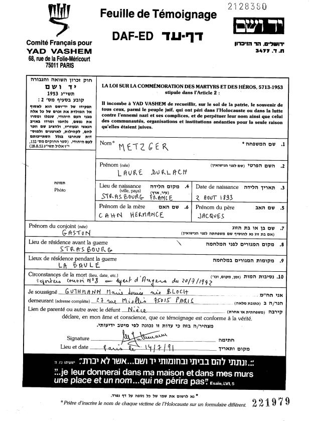 Huguette METZGER [Yad Vashem, en ligne]