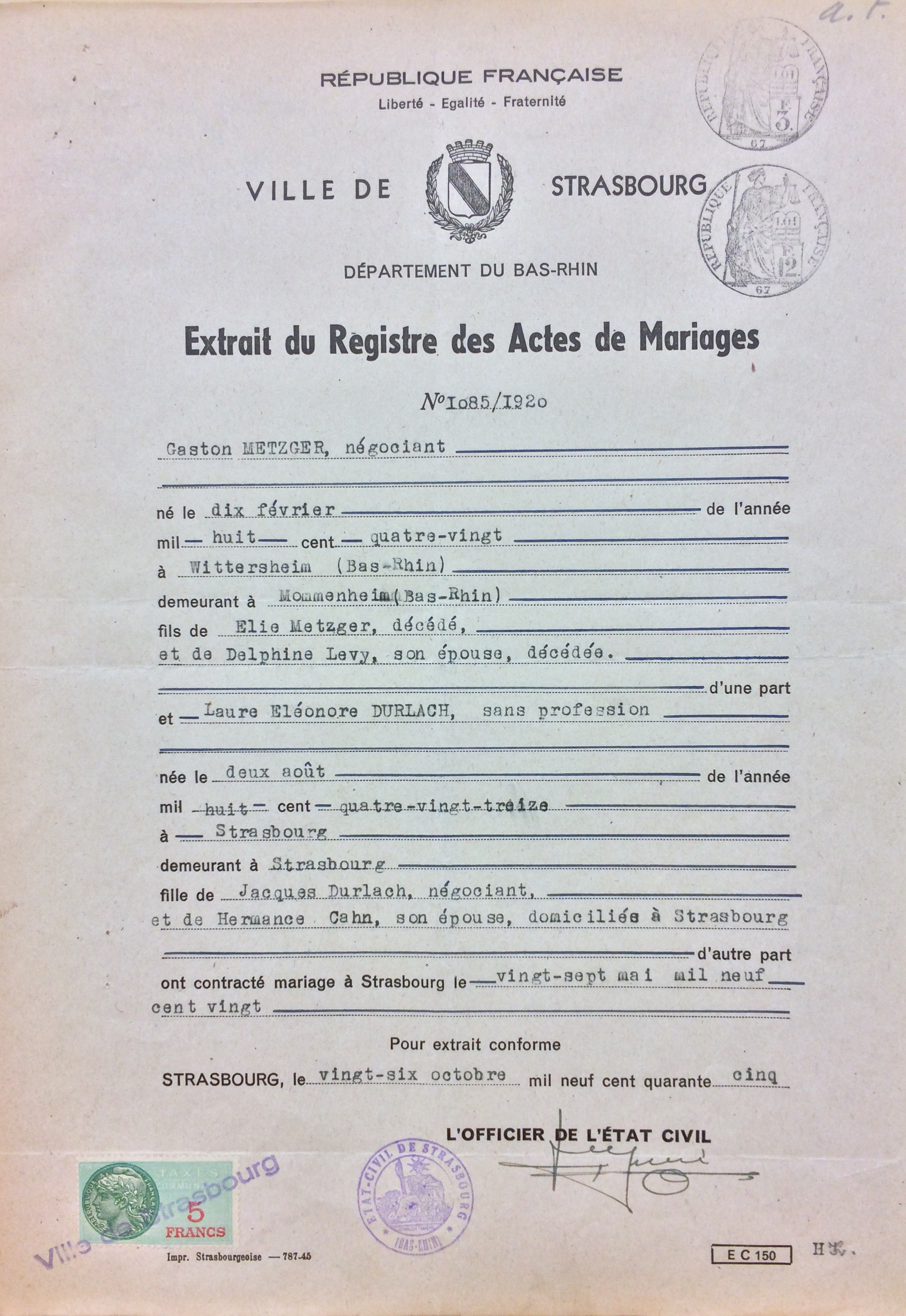 Gaston METZGER est né le 10 février 1880 à Wittersheim (Bas-Rhin) [Père : Elias METZGER et Mère : Delphine LEVY]. Il est marié depuis le 27 mai 1920 (Strasbourg) avec Laure Eléonore (prénom usuel Laure) DURLACH née le 02 août 1893 à Strasbourg. [Père : Jacob DURLACH, fabricant et mère : Hermance CAHN]. Le couple va donner naissance à une fille, Huguette Delphine (prénom usuel Huguette) née le 01 juin 1921 à Strasbourg (Bas-Rhin).