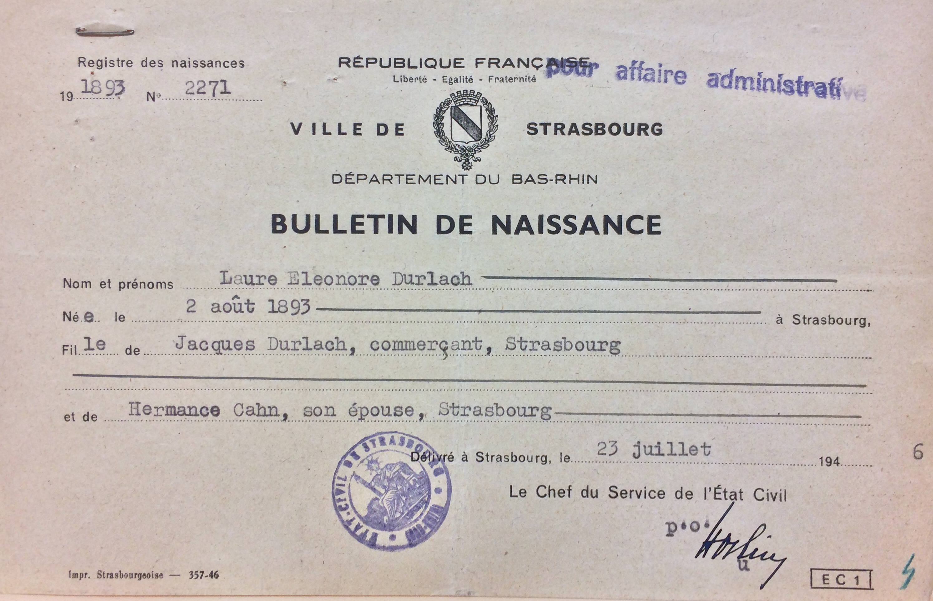 Bulletin de naissance de Laure DURLACH [DAVCC Caen 21 P 515 847]