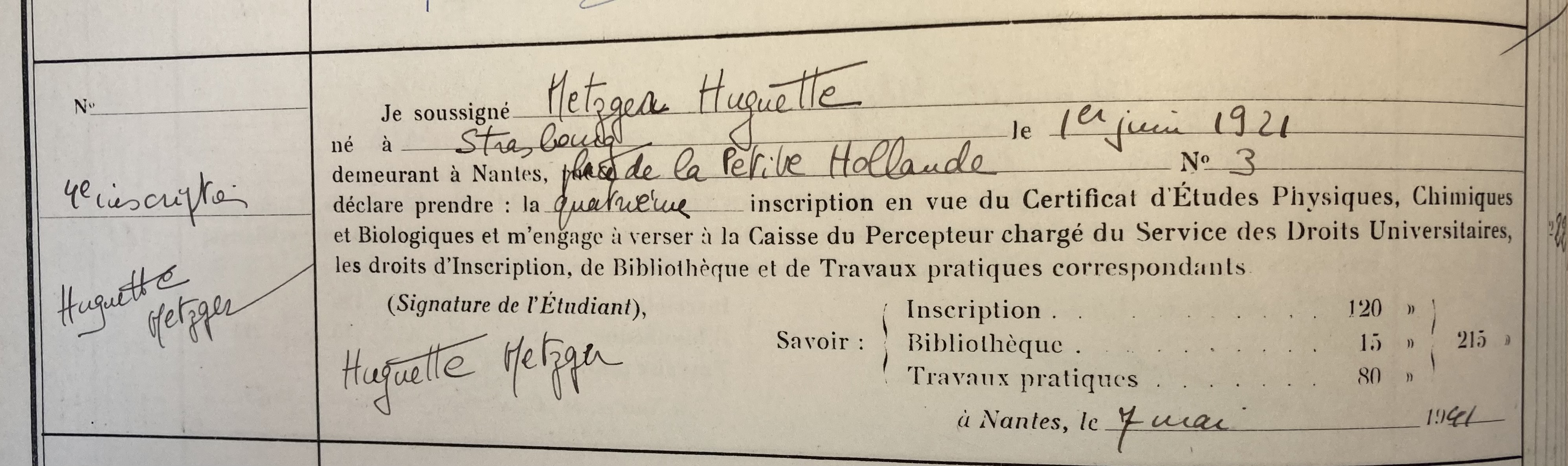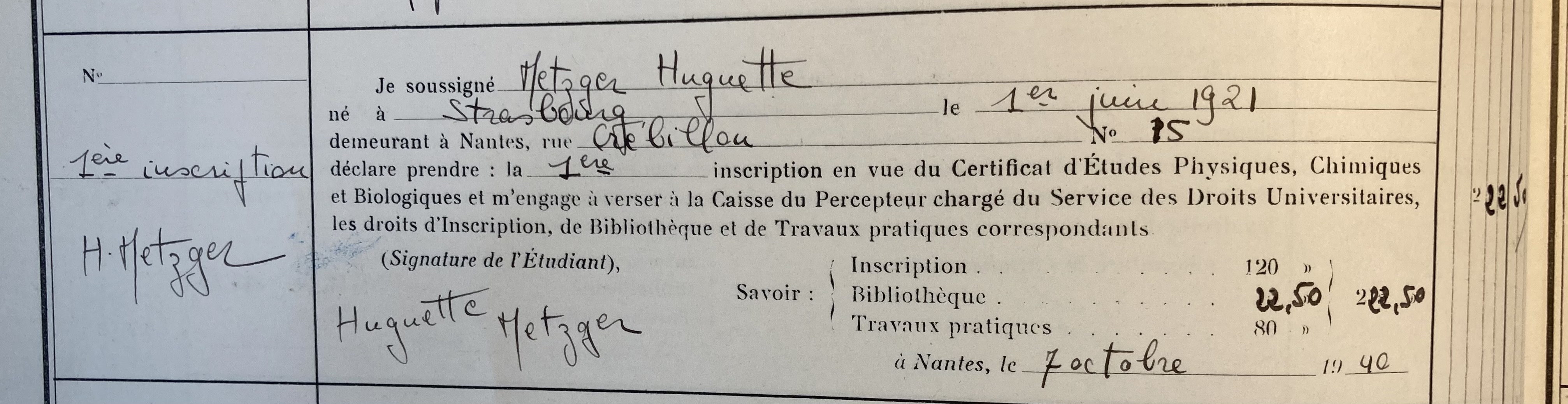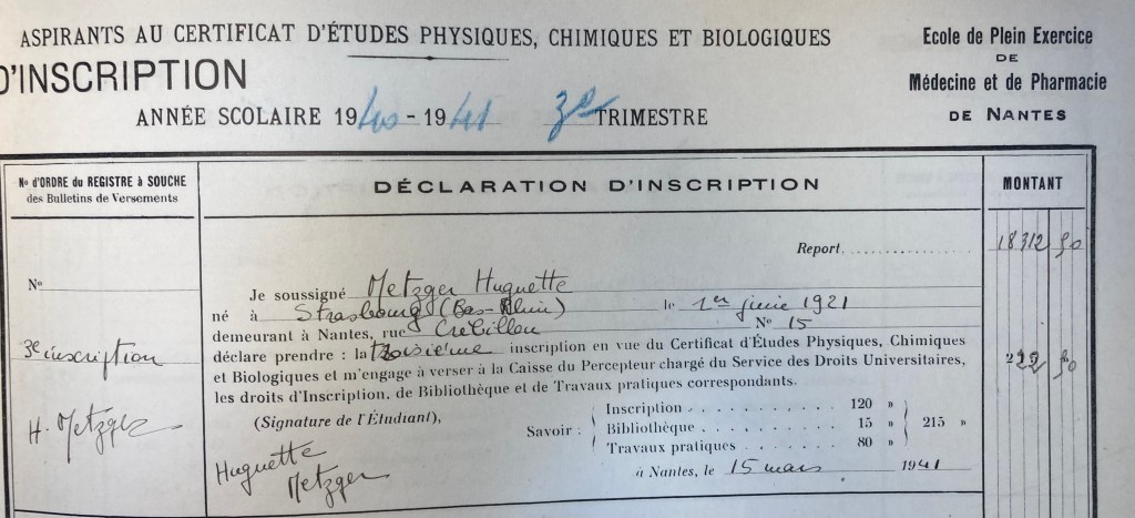 Huguette qui avait obtenu son baccalauréat souhaitait devenir médecin. Elle passe après son baccalauréat le Certificat d’Etudes Physiques, Chimiques et Biologiques à la Faculté de Médecine de Nantes en juin 1941 où elle obtient la mention bien. Ce certificat, obtenu après un an d’études était un préalable pour l’e concours’entrée à la faculté de médecine. Elle réside alors au 15, rue Crébillon à Nantes puis au quatrième trimestre au 3, place de la Petite Hollande à Nantes.