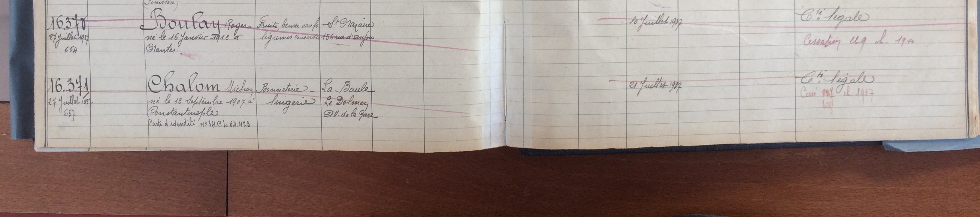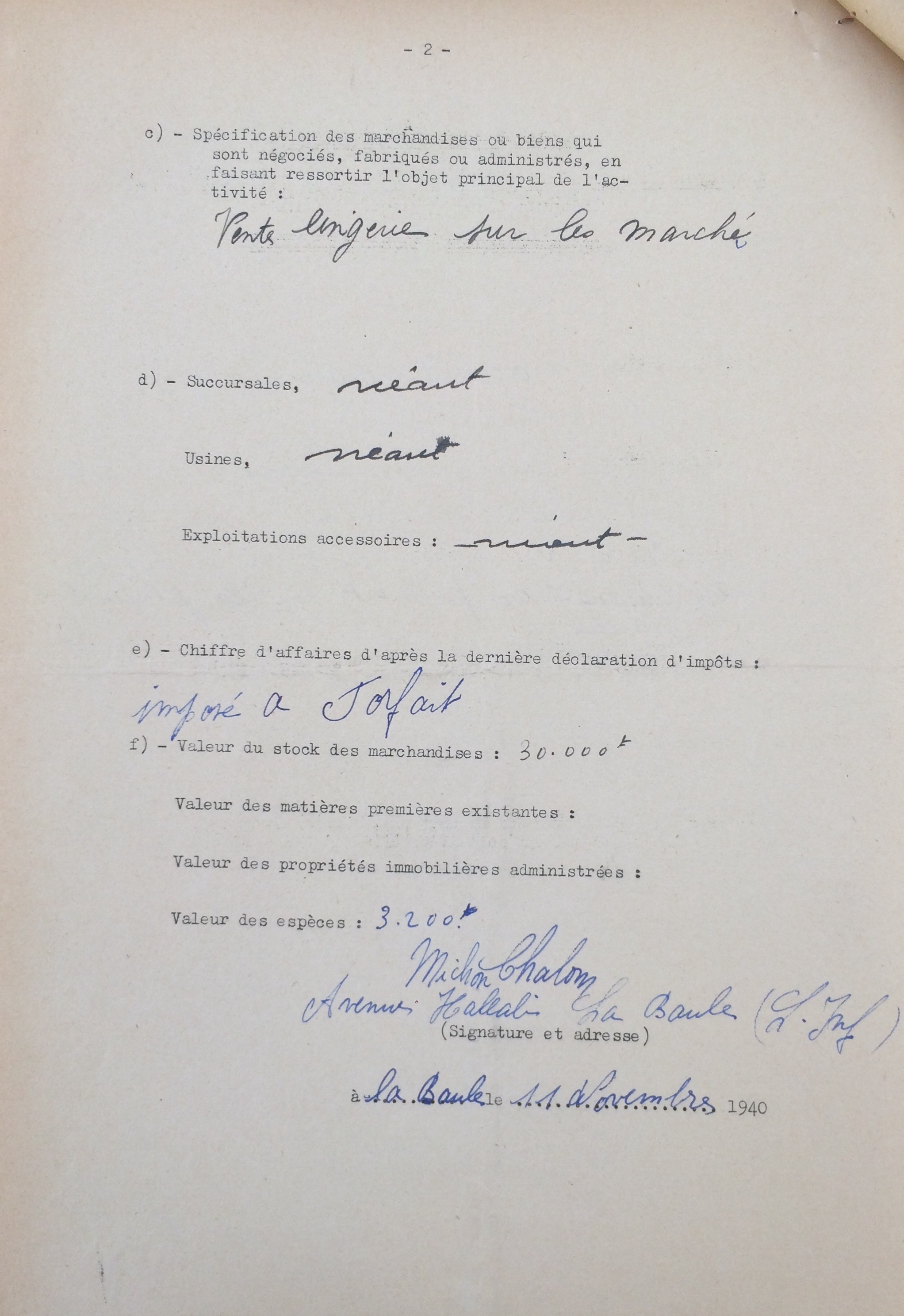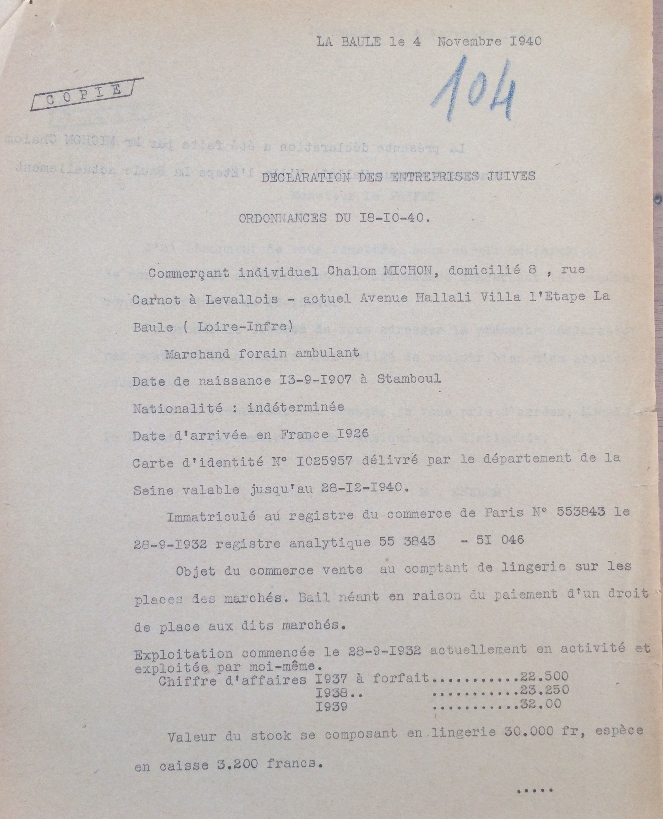 Il déclare par ailleurs son commerce auprès de la sous-préfecture de Saint-Nazaire le 11 novembre 1940.