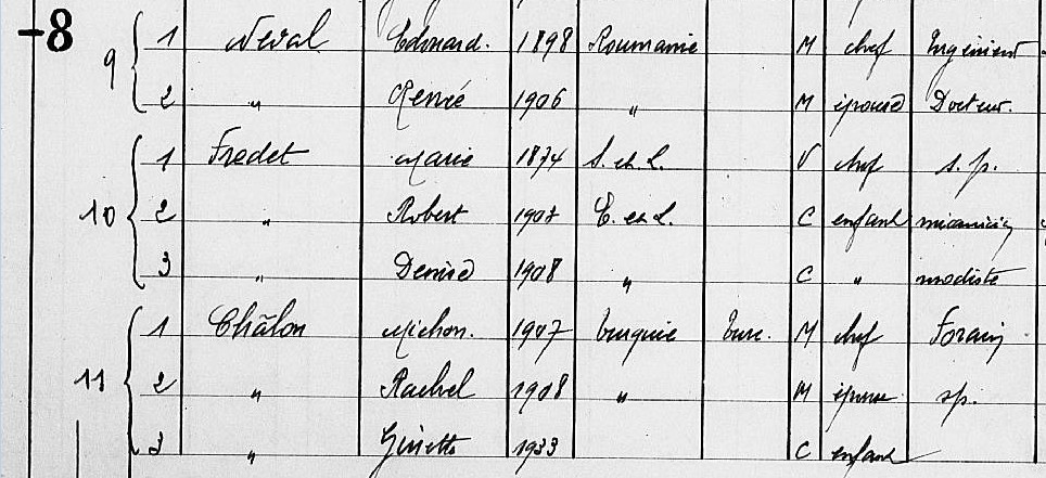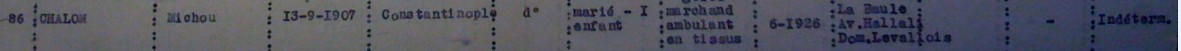 Michon CHALOM est né le 13 septembre 1907 à Constantinople et est arrivé en France en juin 1926. Il est marié avec Rachel née en 1908 et le couple a un enfant (en 1936) Ginette née en 1933. Il est originaire de Levallois-Perret où il réside au 8, rue Carnot en 1936.