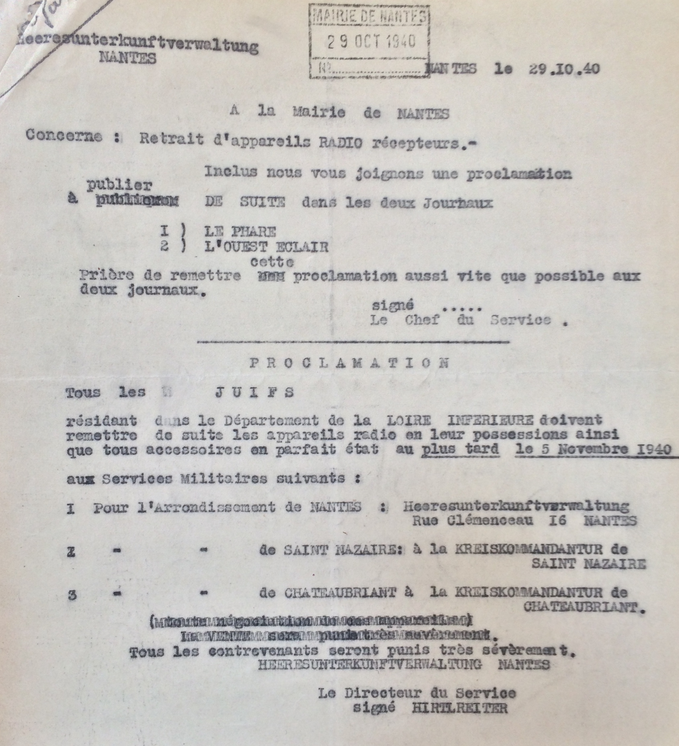 La même ordonnance allemande oblige les Juifs à déclarer leur commerce auprès de la Préfecture de Loire-Inférieure.