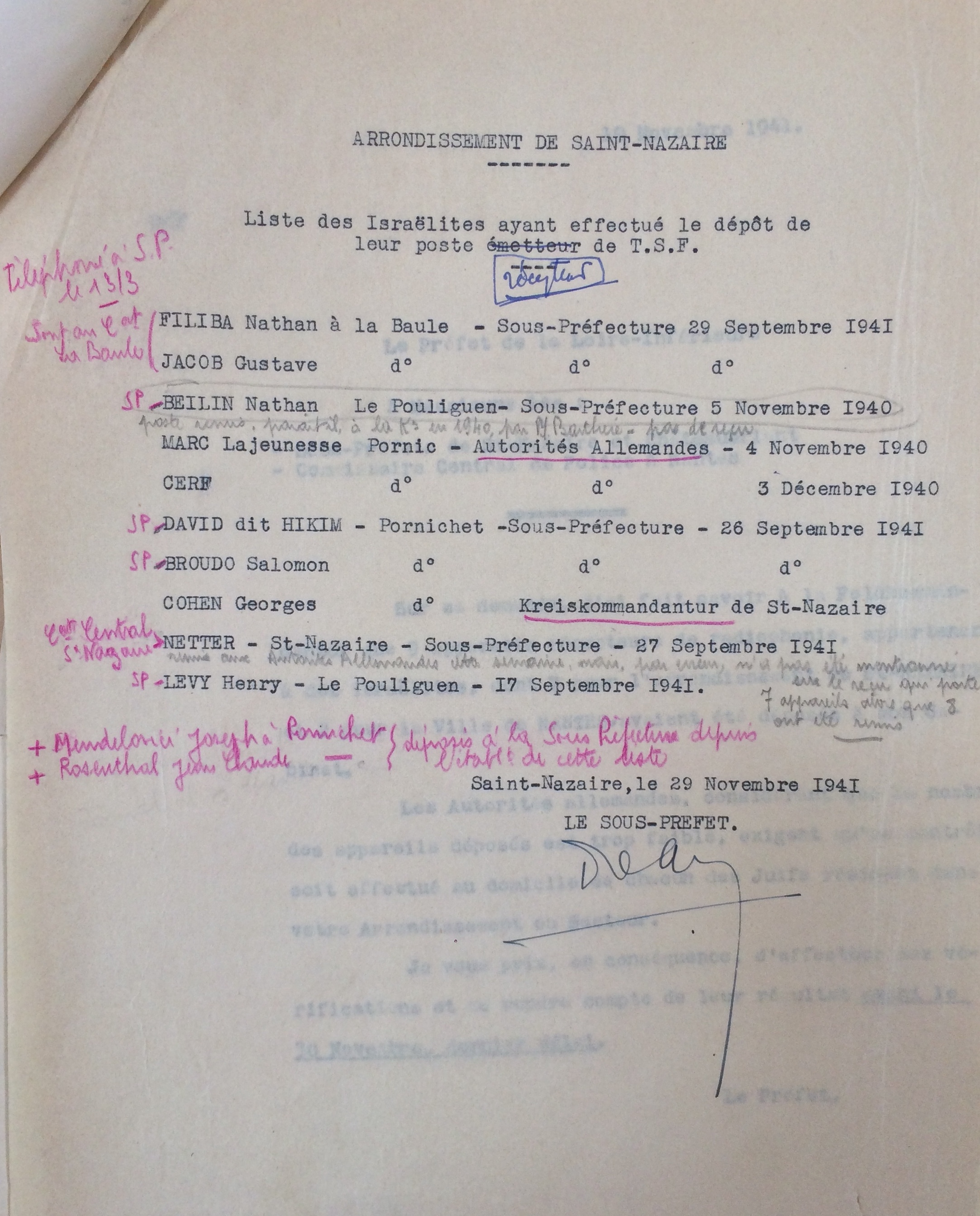 Par ailleurs, la TSF de la famille est confisquée et et ramenée vers le mois de décembre 1941 à la sous-préfecture de Saint-Nazaire.