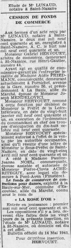 Les deux commerces sont aryanisés. Les scellés sont apposés sur les magasins entre le 03 et le 05 décembre 1940, une affichette « Judische Gesellschaft » est apposée sur la devanture, des inventaires sont dressés pour lister les marchandises à vendre et un administrateur provisoire est nommé en la personne de Gabriel HERVOUËT, arbitre de commerce à Saint-Nazaire pour vendre les commerces.