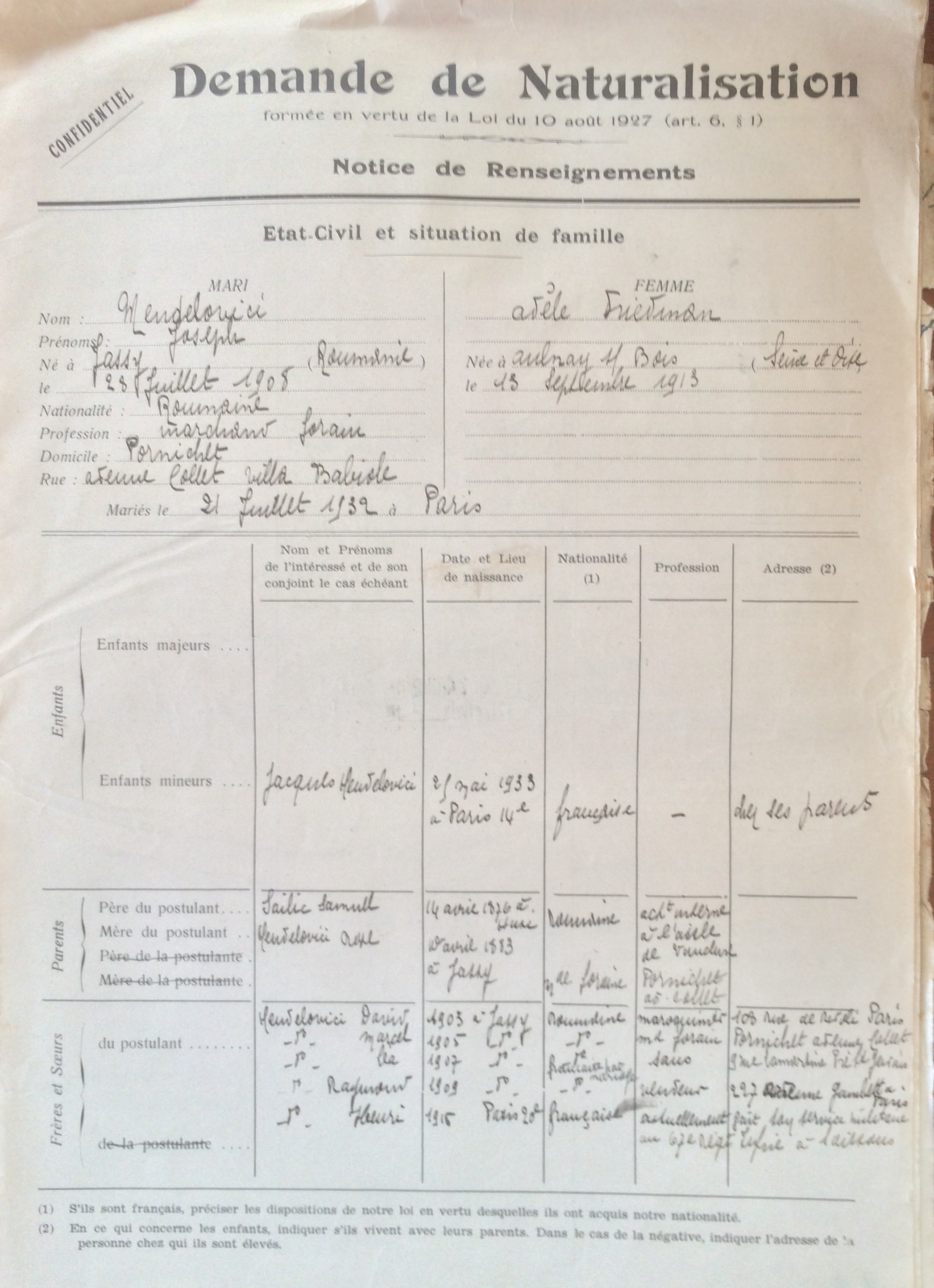 Joseph MENDELOVICI et sa famille arrive de Paris du 108, rue de Rivoli (4ème arrondissement) à Pornichet le 23 novembre 1938 où ils font viser leur cartes d’identité pour étrangers auprès de la mairie de Pornichet comme l’y oblige la loi. Joseph est marié depuis le 21 juillet 1932 (Paris) avec Adèle FRIEDMANN née le 13 septembre 1913 à Aulnay-sous-Bois (Seine-et-Oise). Le couple a deux enfants : Jacques né le 25 mai 1933 à Paris (14ème arrondissement) et Monique née le 12 septembre 1939.
