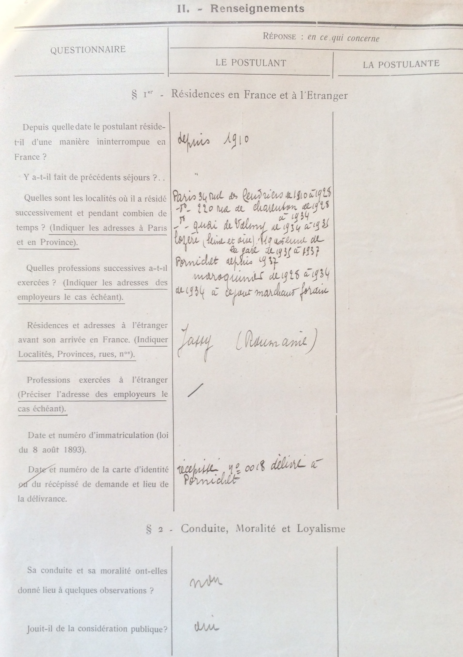La famille se tient parfaitement au courant de l’actualité internationale, de la montée du fascisme en Allemagne, des persécutions antisémites qui ont déjà eu lieu en Autriche, eux-mêmes étant originaires de Iassy (Roumanie), lieu connu pour ses violentes persécutions antisémites et ses pogroms. Ce n’est donc pas un hasard si, présent depuis plus de trente ans sur le sol français, Joseph (et Rose) font une demande de naturalisation en juin 1939, dossier déposé dans un premier temps à la mairie de Pornichet. Adèle, l’épouse de Joseph née en Seine-et-Oise a perdu sa qualité de française par mariage, et Jacques et Monique possèdent la nationalité française par déclaration.