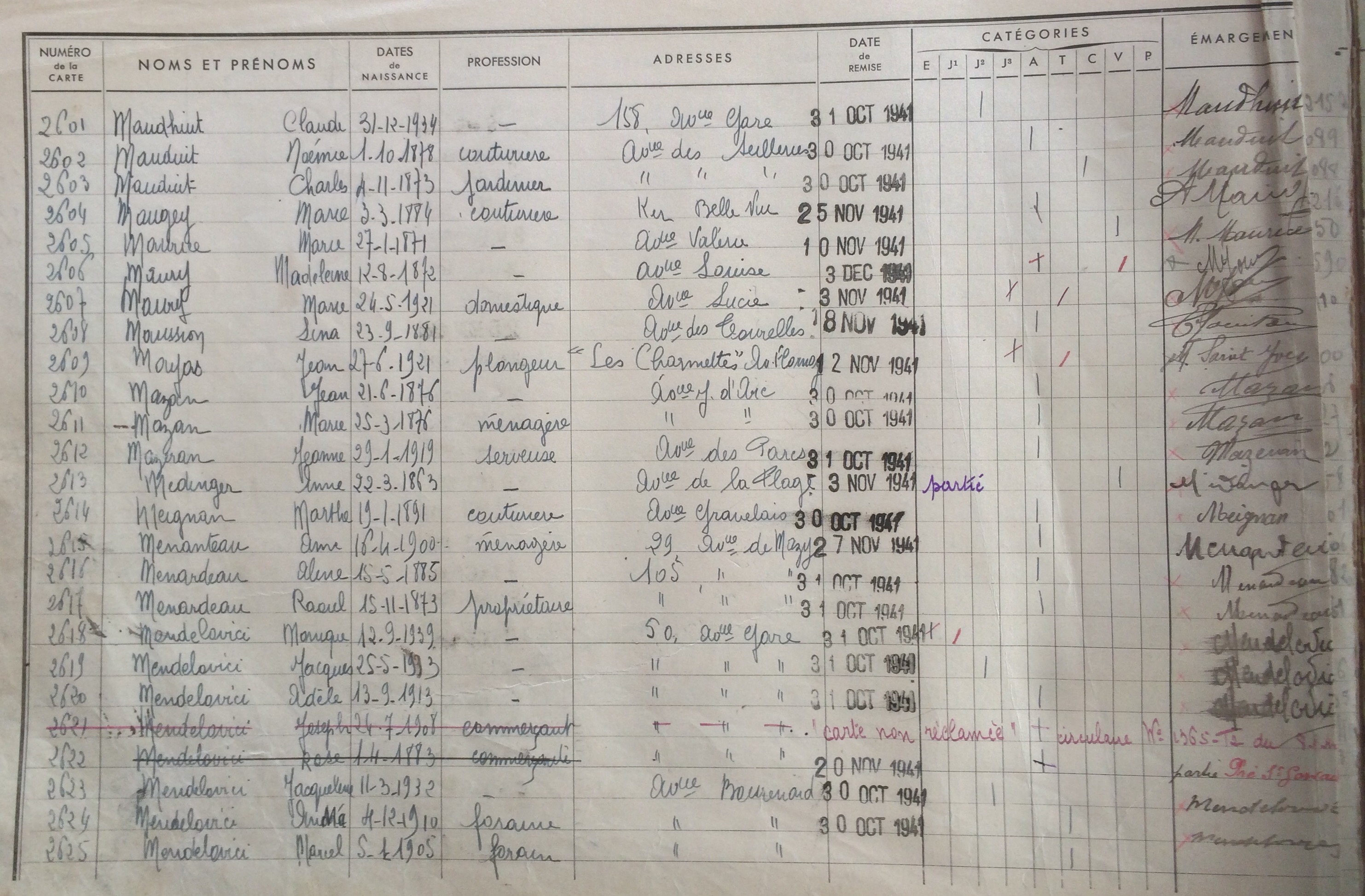 Registre de distribution des cartes d'alimentation [Archives Municipales de Pornichet]