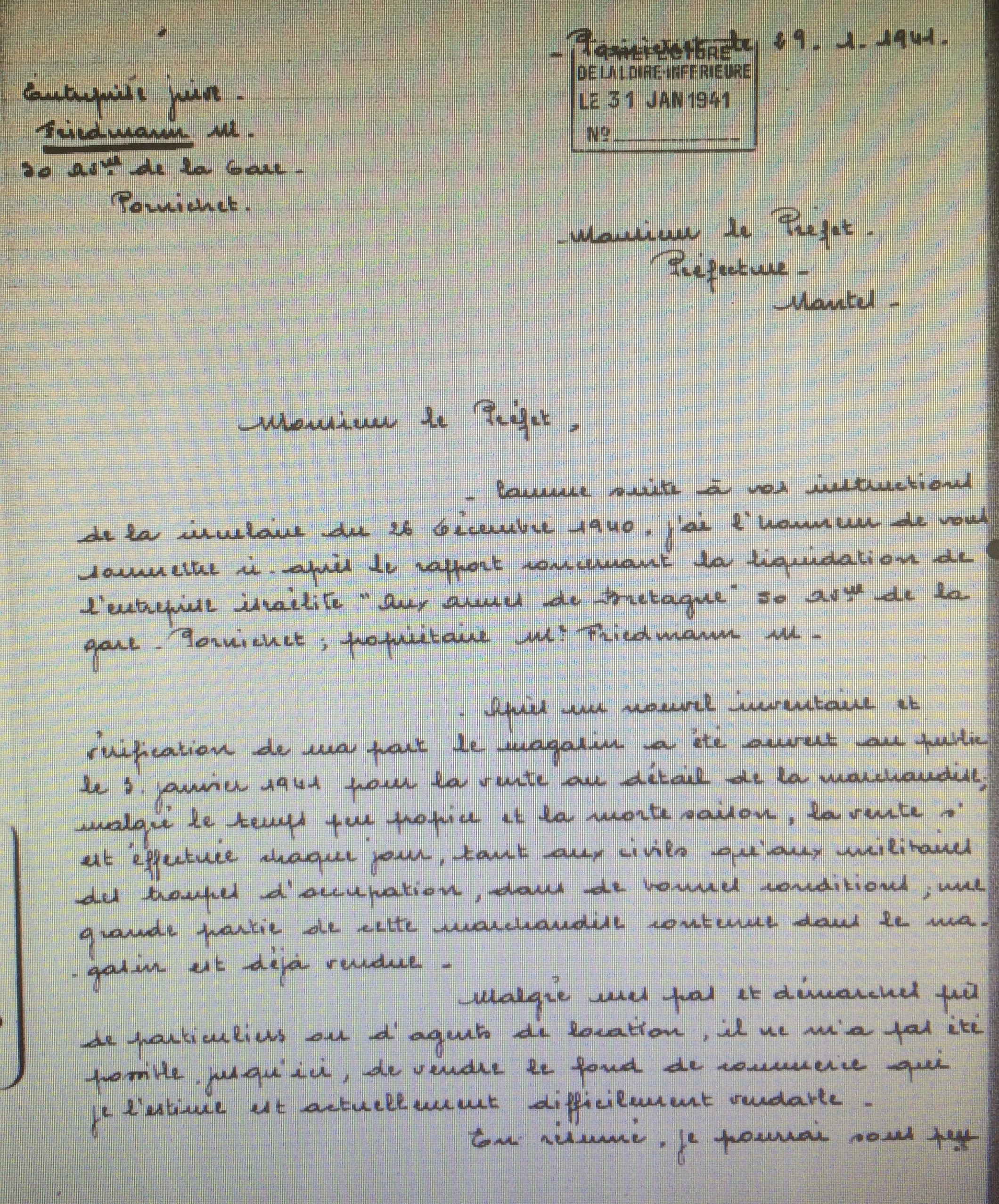 Les autorités préfectorales ont considéré à tort que Maurice FRIEDMANN tenait un commerce sur Pornichet au 50, avenue de la Gare. Hors ce commerce est tenu par Adèle /Rose MENDELOVICI et Maurice y est juste employé en tant qu’artisan tailleur. Un administrateur provisoire est nommé en la personne d’André PORCHER villa Les Sirènes avenue de la plage à Pornichet le 27 décembre 1940 qui rend compte au Préfet.
