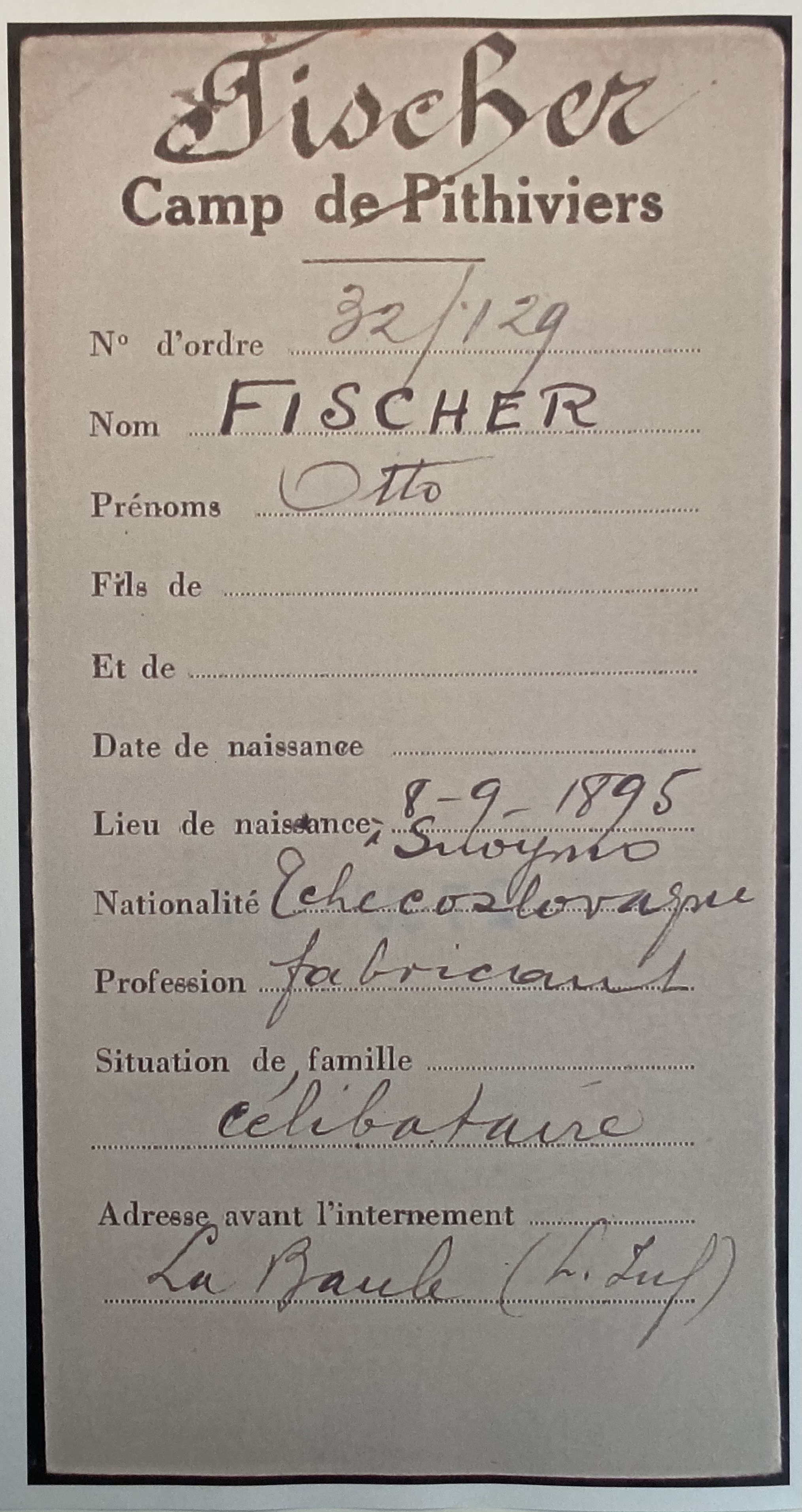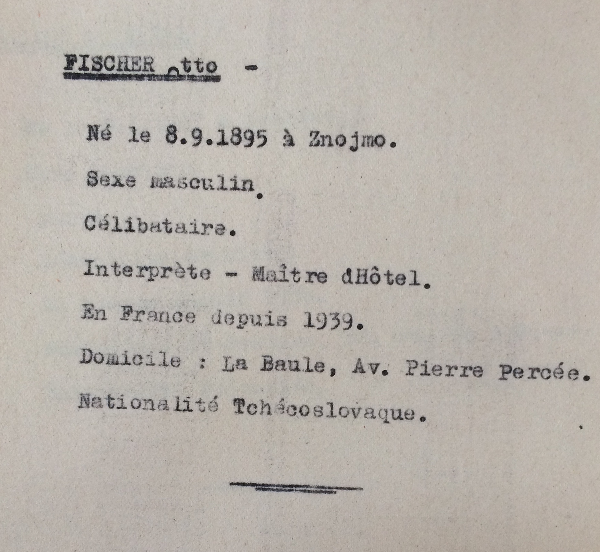 Otto FISCHER est né le 08 septembre 1895 à Znojmo (Znaïm) en Tchécoslovaquie [Père : FISCHER Friedman et Mère : WEINBERGER Amalie]. Célibataire, il exerce la profession de maître d’hôtel mais également à La Baule, il va exercer la profession de garçon-interprète. Il habite Villa Les Saisons, avenue de la Pierre Percée comme la famille SPITZER dont l’épouse Bedrichka exerce également la même profession et qui est de même nationalité, tchécoslovaque. Otto FISCHER est arrivé en France vraisemblablement en août 1939. Il réside alors à Vineuil-Saint-Firmin (Oise) puis au 9 novembre 1939 au 2, rue de Gramont à Paris (2ème arrondissement) et arrive à La Baule en 1940.