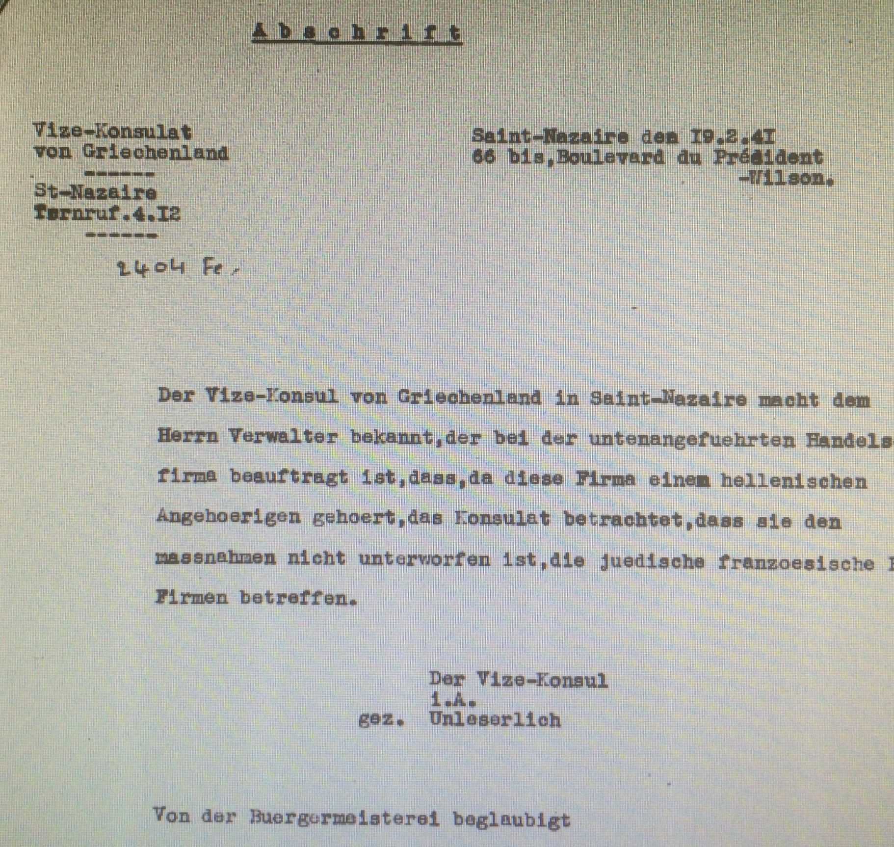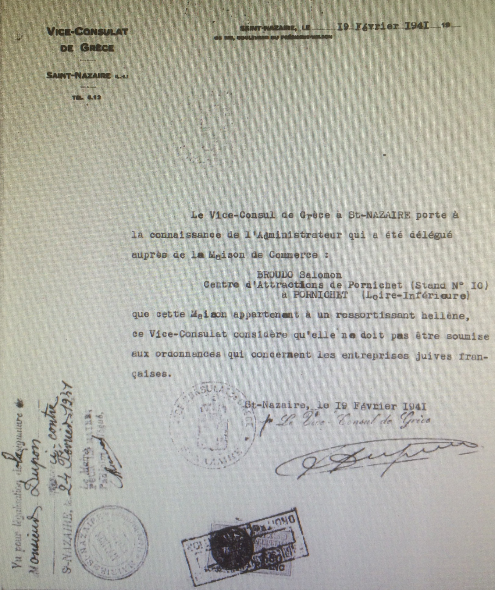 Salomon tente de sursoir à la liquidation et demande au Vice-Consulat de Grèce à Saint-Nazaire une dérogation eu égard à sa nationalité. Cette demande est envoyée à la Préfecture de Loire-Inférieure puis transmise aux Autorités allemandes.