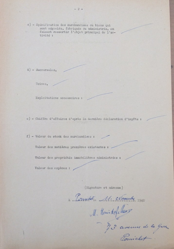 Dans le cadre du « désenjuivement de l’économie française », toute personne d’origine juive supposée tenir un commerce doit déclarer son entreprise auprès de la Préfecture de Loire-Inférieure. C’est ce que fait Mejlach le 11 novembre 1940 mais il ne tient aucun commerce : il est ouvrier horloger au 73, avenue de la Gare à Pornichet.