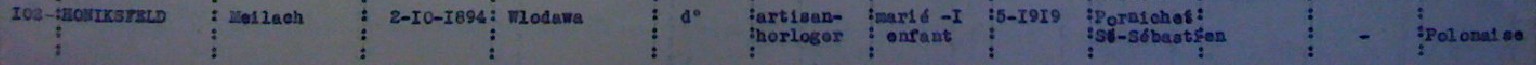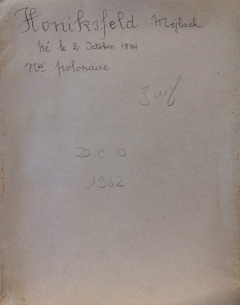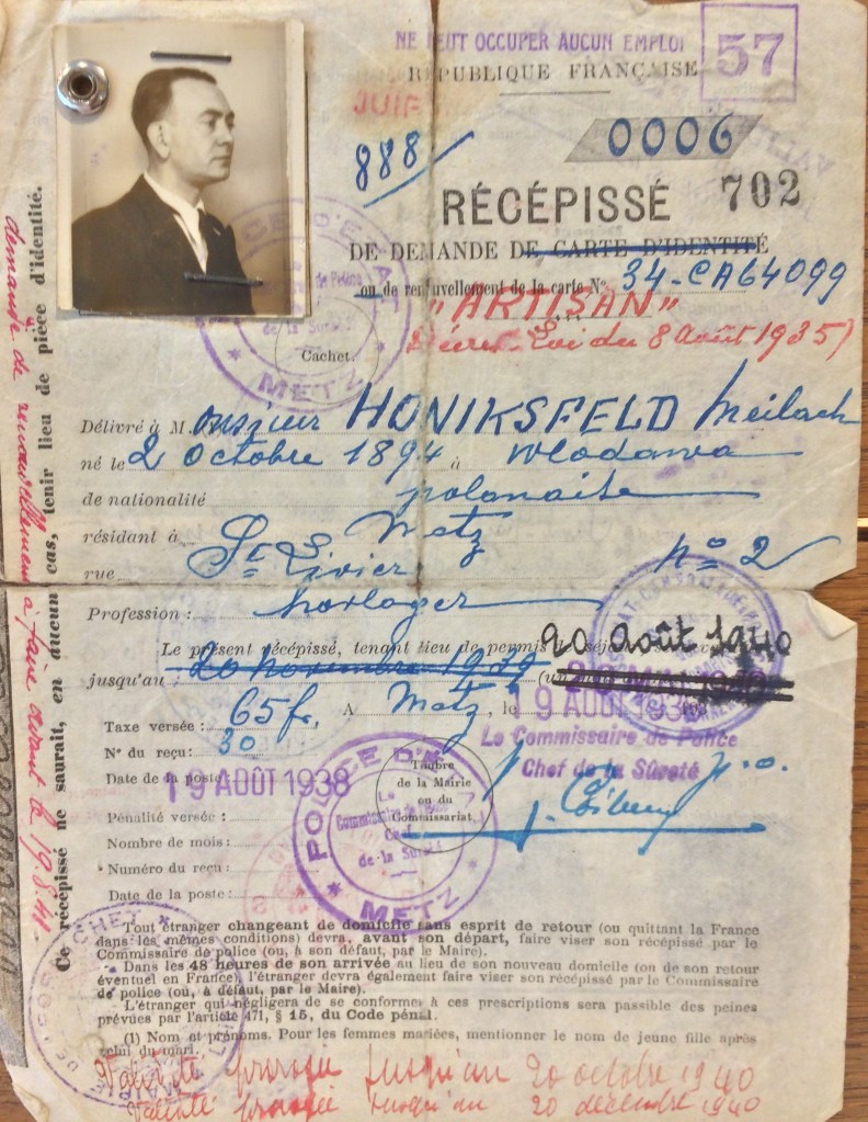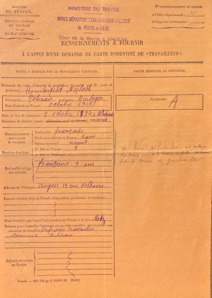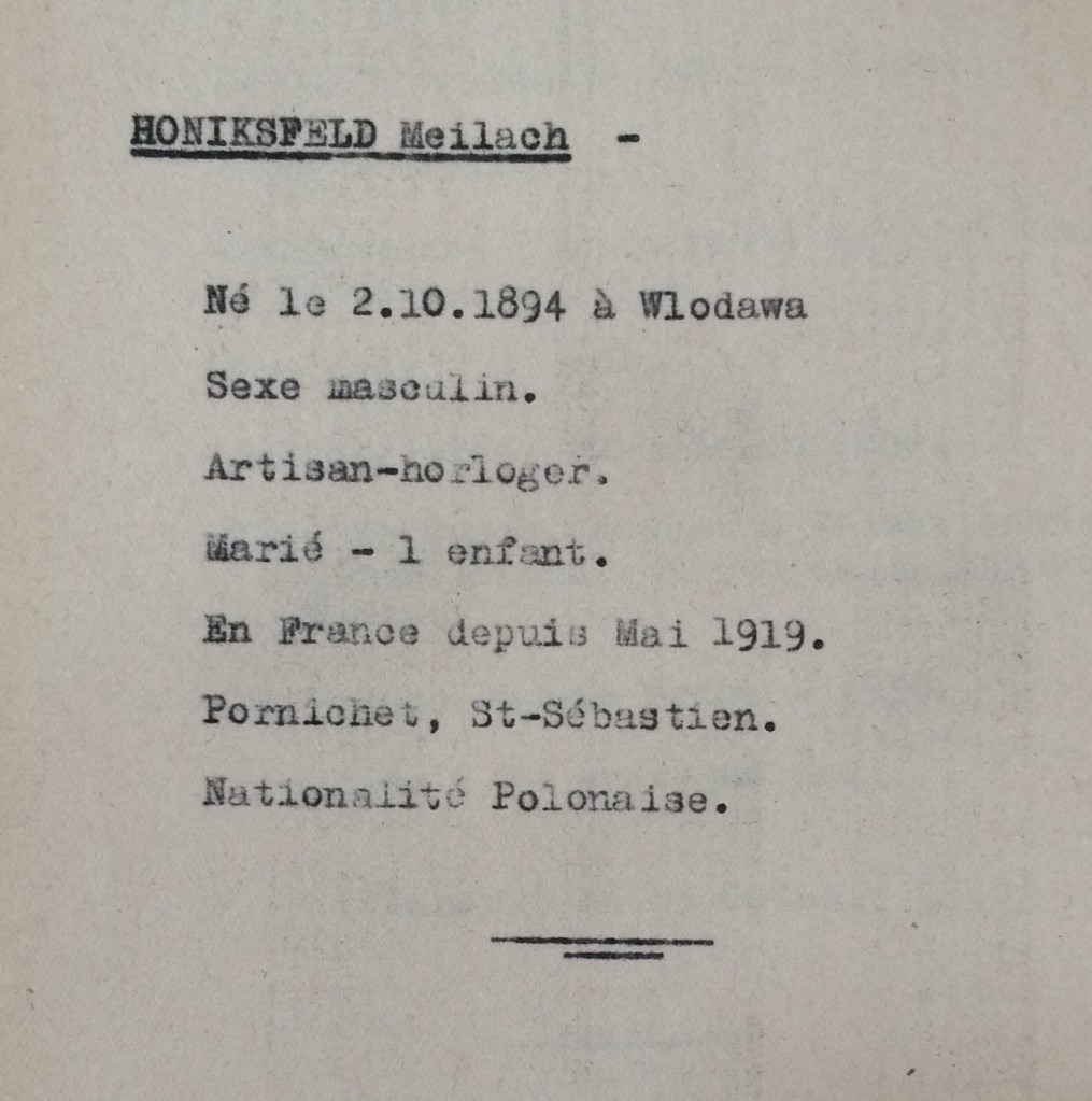 Mejlach HONIKSFELD est né le 02 octobre 1894 à Wlodawa, ville située à l’est de la Pologne près de la frontière ukrainienne et biélorusse. Arrivé en France en mai (ou février) 1919, Mejlach est marié avec Dora née le 07 septembre 1909. Le couple a un enfant, Jeanne née le 08 mai 1932 et habite Saint-Sébastien à Pornichet. Mejlach exerce la profession d’artisan-horloger et est originaire de Metz.