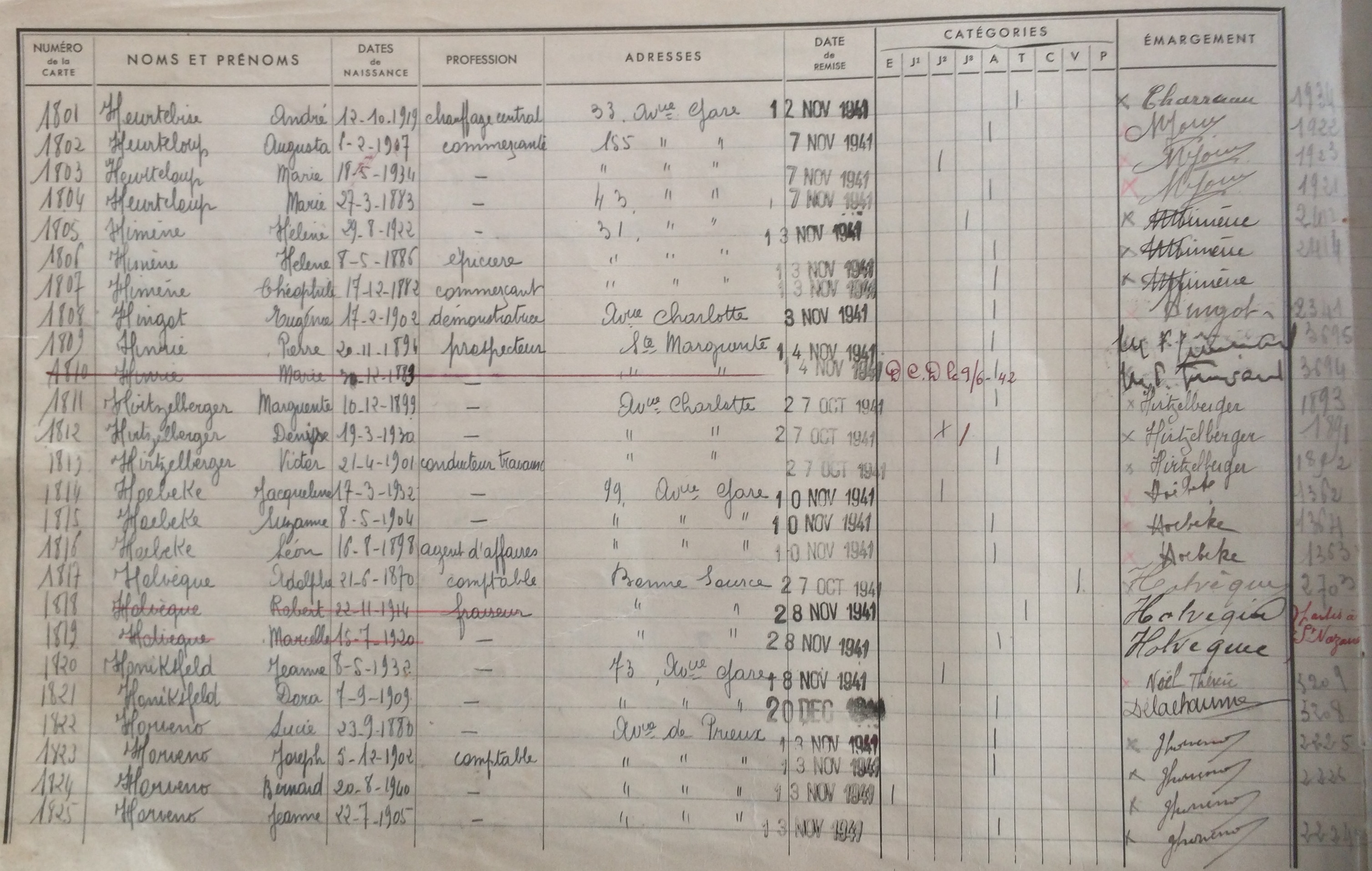 La Mairie de Pornichet tient un registre alphabétique des personnes susceptibles de recevoir une carte d’alimentation. Mejlach n’y apparaît pas. La zone côtière étant devenue zone côtière interdite, il était impossible pour Mejlach de retourner à Pornichet. En revanche, son épouse Dora ainsi que leur fille Jeanne y sont présents. Mais ce ne sont pas eux qui viennent récupérer leur carte. Thérèse NOËL vient récupérer celle de Jeanne le 18 novembre 1941 et André ou Thérèse DELACHAUME viennent récupérer celle de Dora le 20 décembre 1941. Ils habitent tous au 73 avenue de la Gare. Les cartes individuelles d’alimentation étant nominatives, il est probable que par prudence ou pour rendre sevice, une personne proche se soit déplacée pour les récupérer et les donner à Dora et Jeanne.
