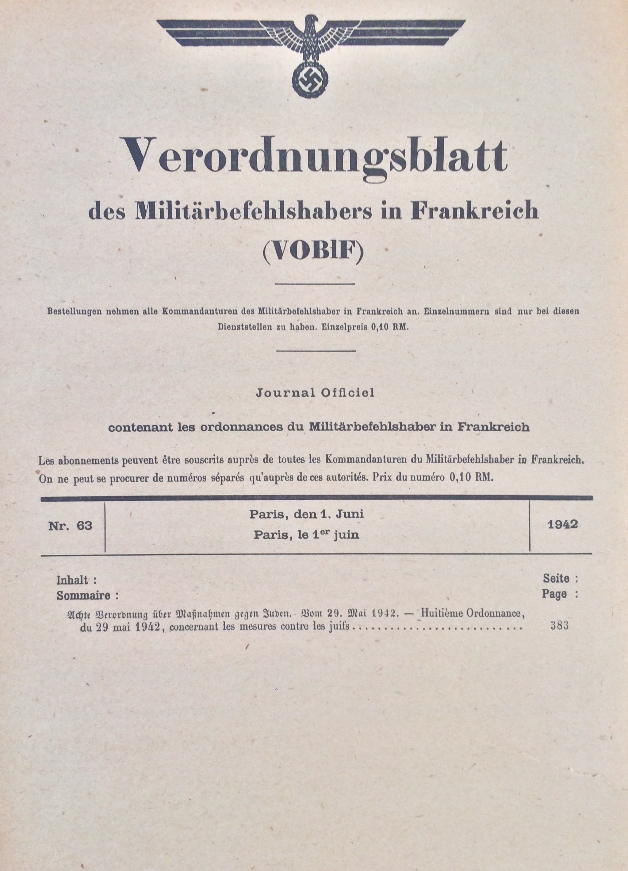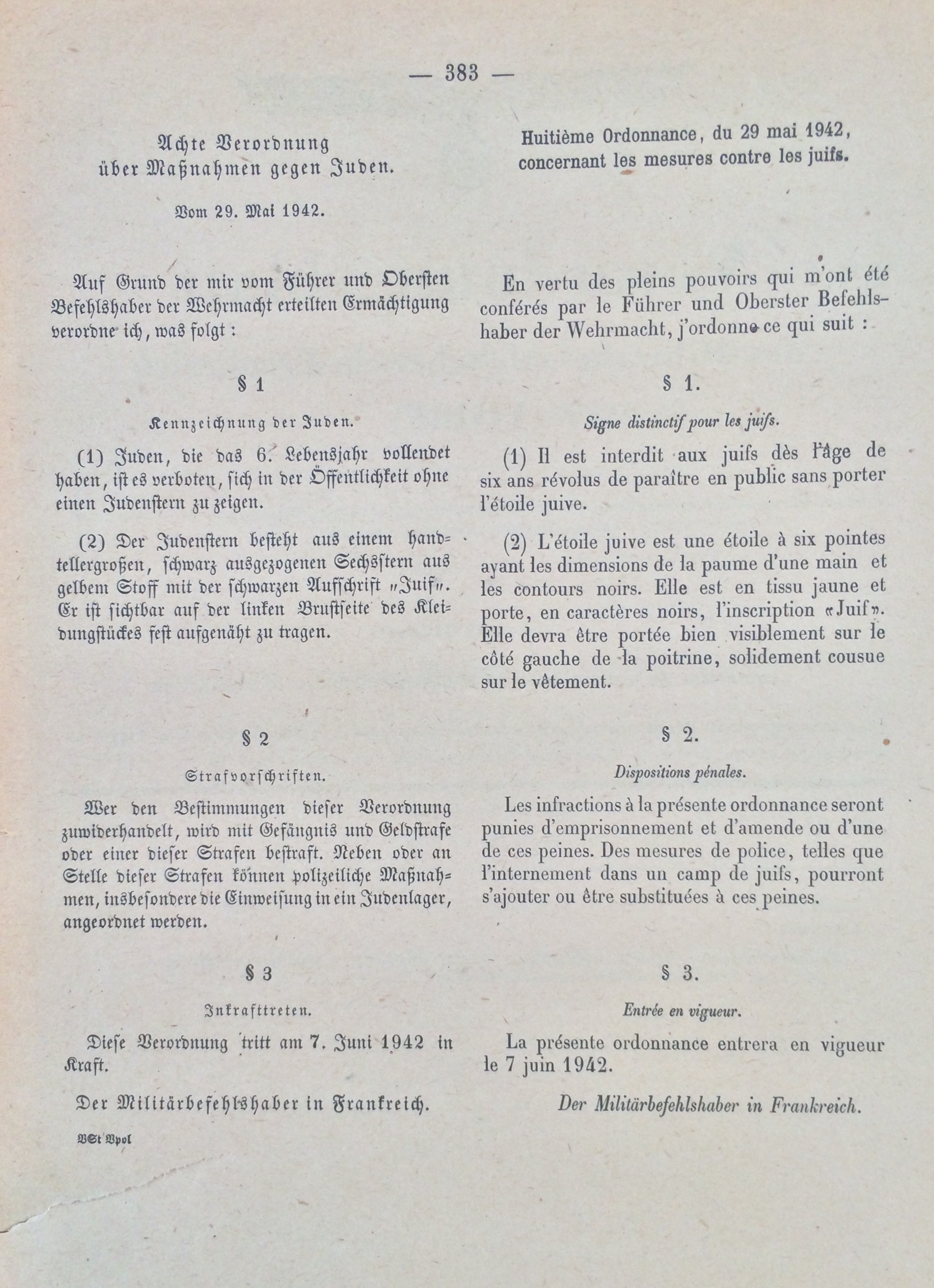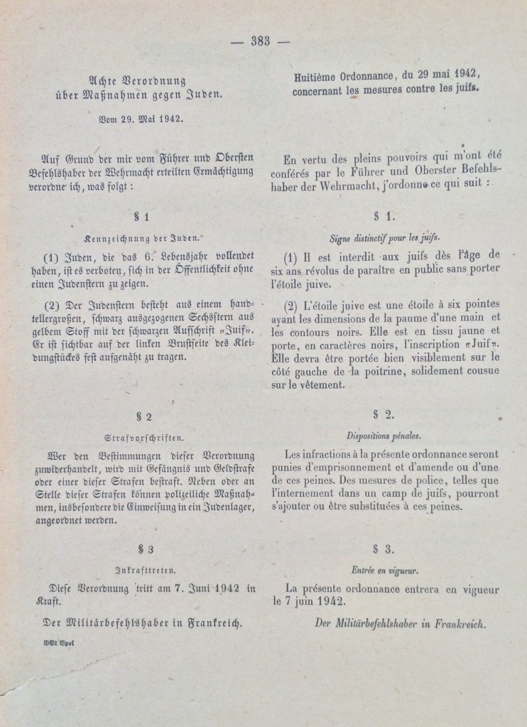 Suite à la 8ème ordonnance allemande du 29 mai 1942 et entrée en vigueur le 07 juin 1942, les Juifs âgés de plus de 6 ans, enfants compris, doivent porter une « insigne spéciale »: l’étoile jaune.
