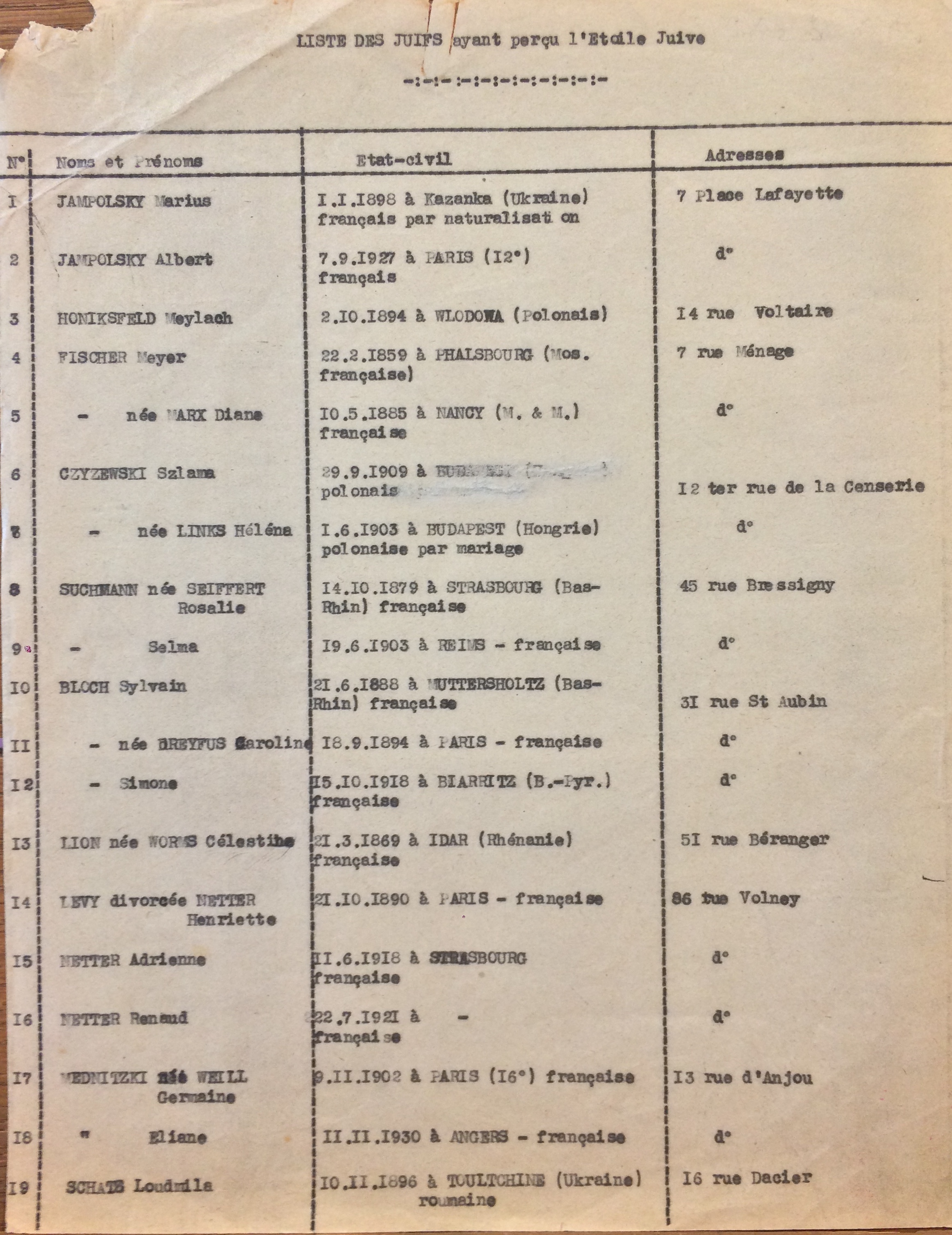 Liste dactylographiée de distribution de l’étoile pour les Juifs [ADML 303W92]