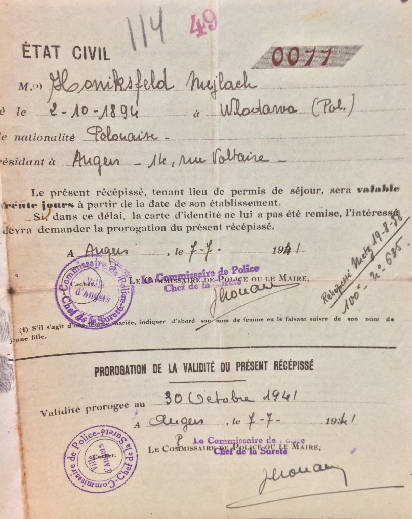 Mejlach HONIKSFELD est arrêté et remis le 18 juin 1942 au SIPO-SD (Sicherheitspolizei [Sipo]-Sicherheitsdienst [SD] d’Angers qui l’incarcère à la prison du Pré Pigeon à Angers secteur allemand à 21h45.