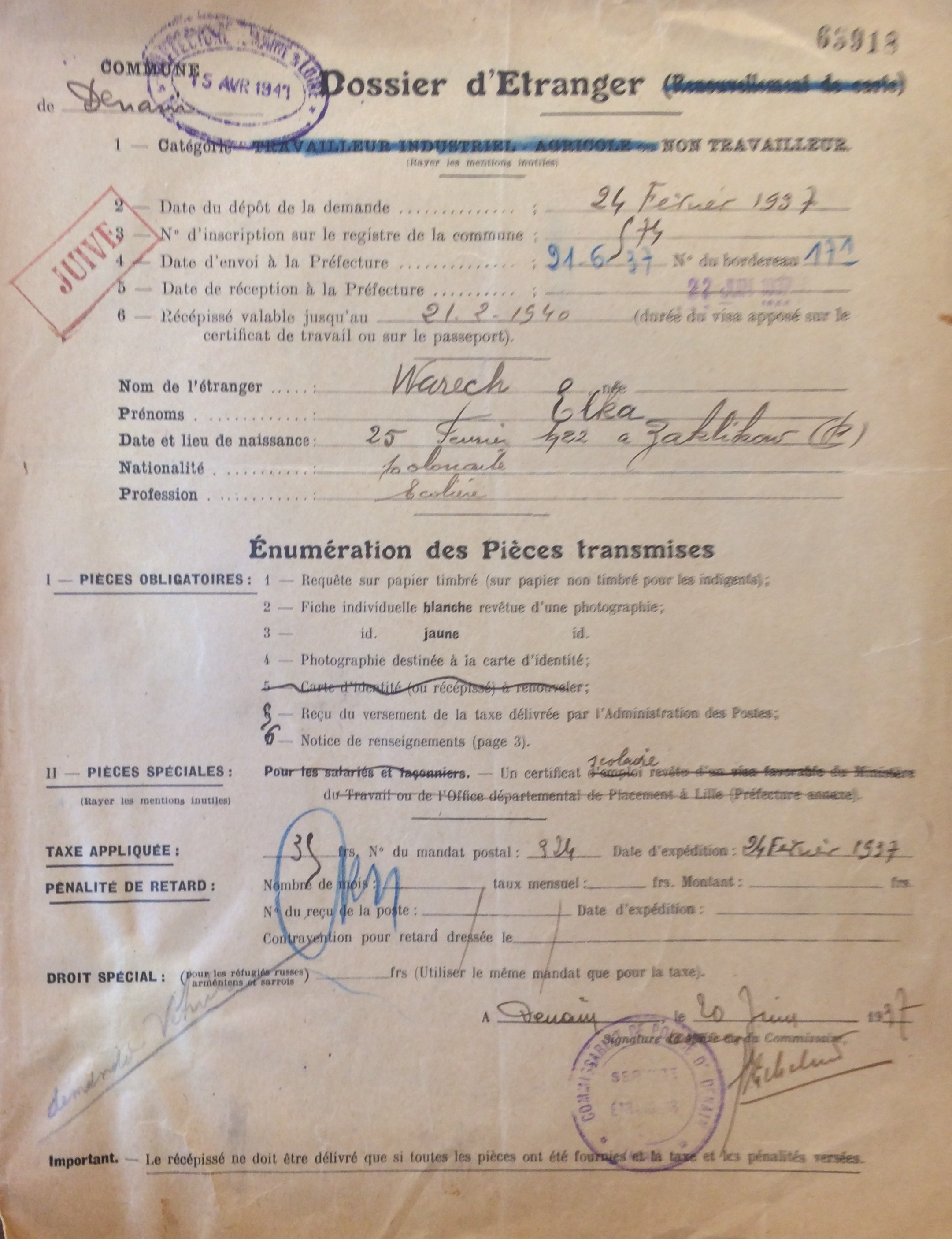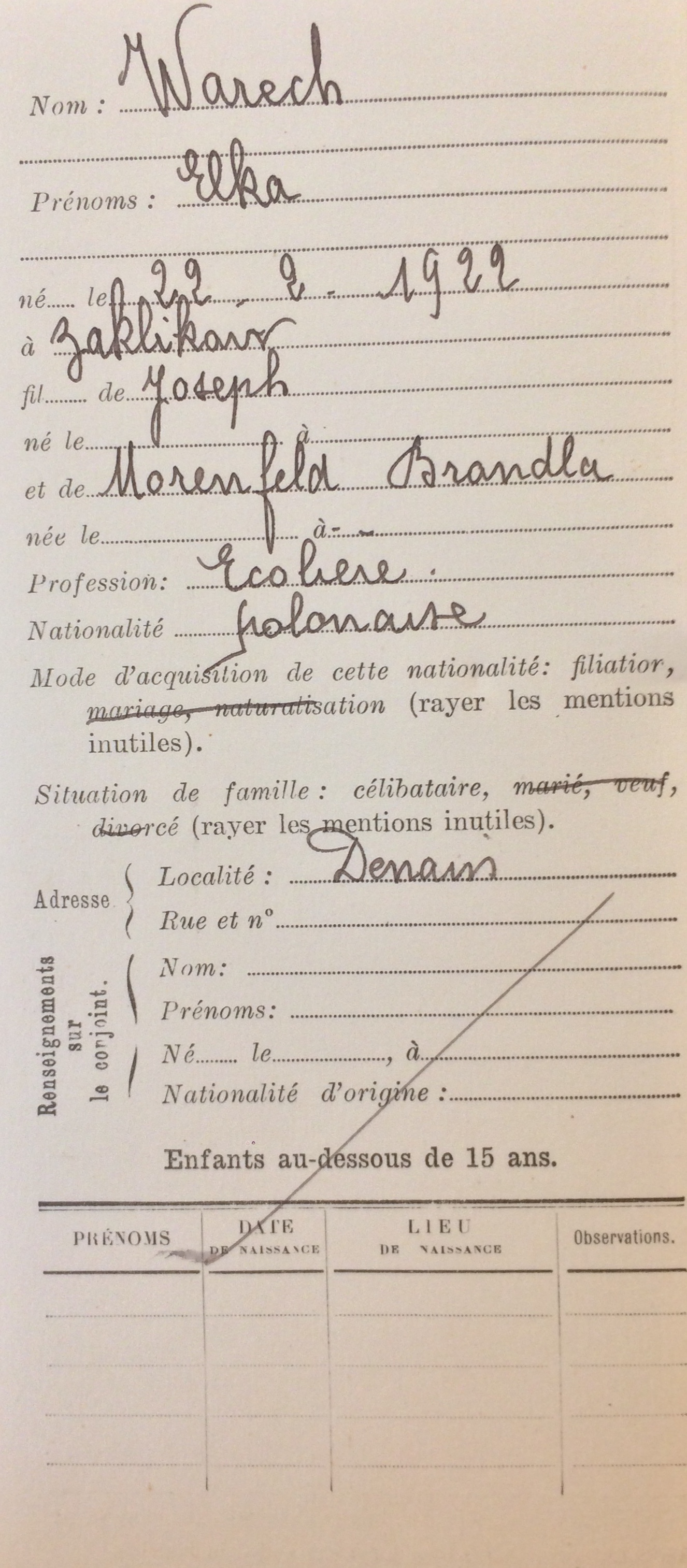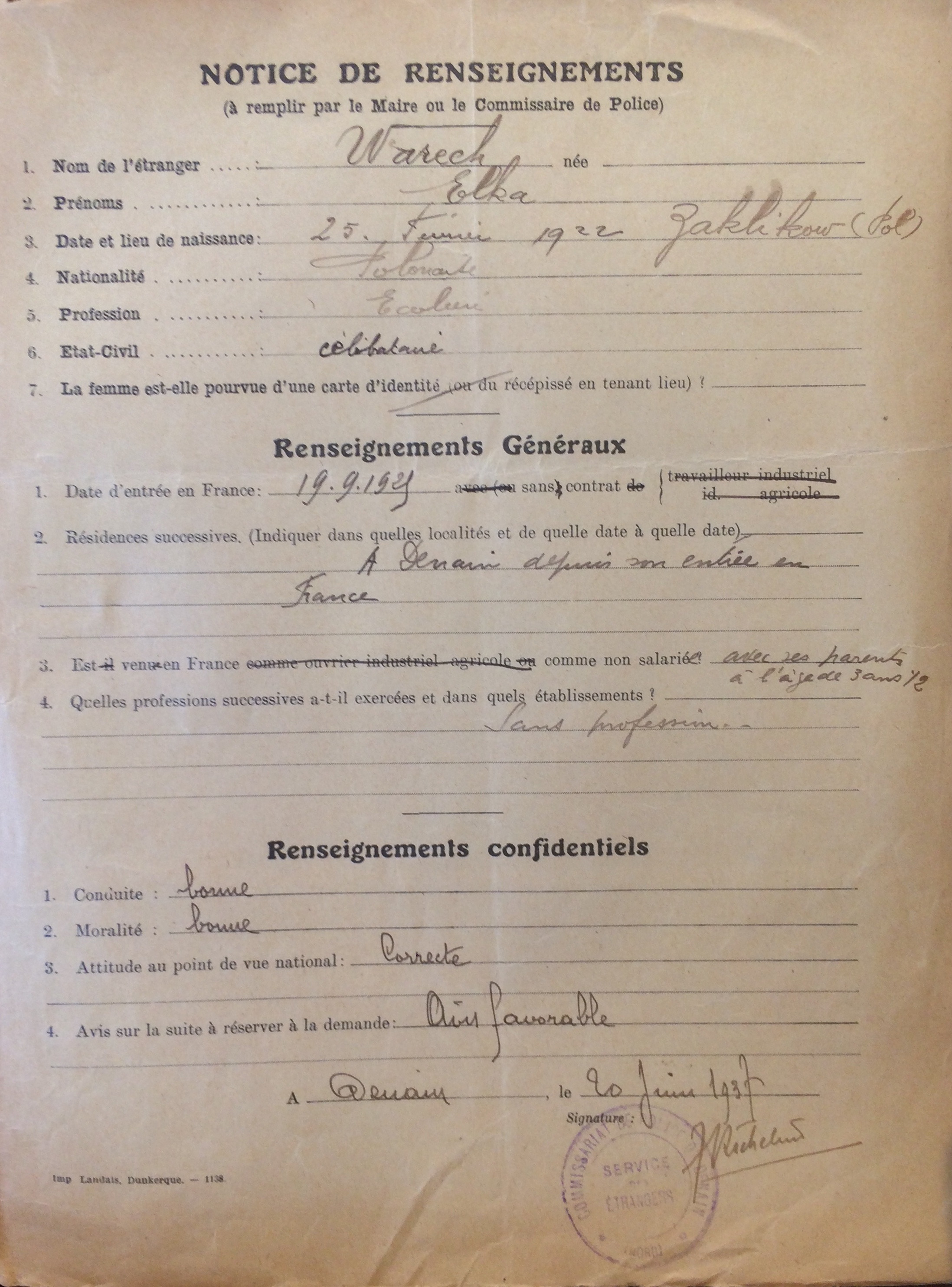 Elka WARECH est née le 25 février 1922 à Zaklikow (Pologne). [Père : Joseph WARECH et Mère : MORENFELD Brendla]. La famille est arrivée en France le 19 septembre 1925 et réside dans le département du Nord à Denain au 58 rue Jean Jaurès.