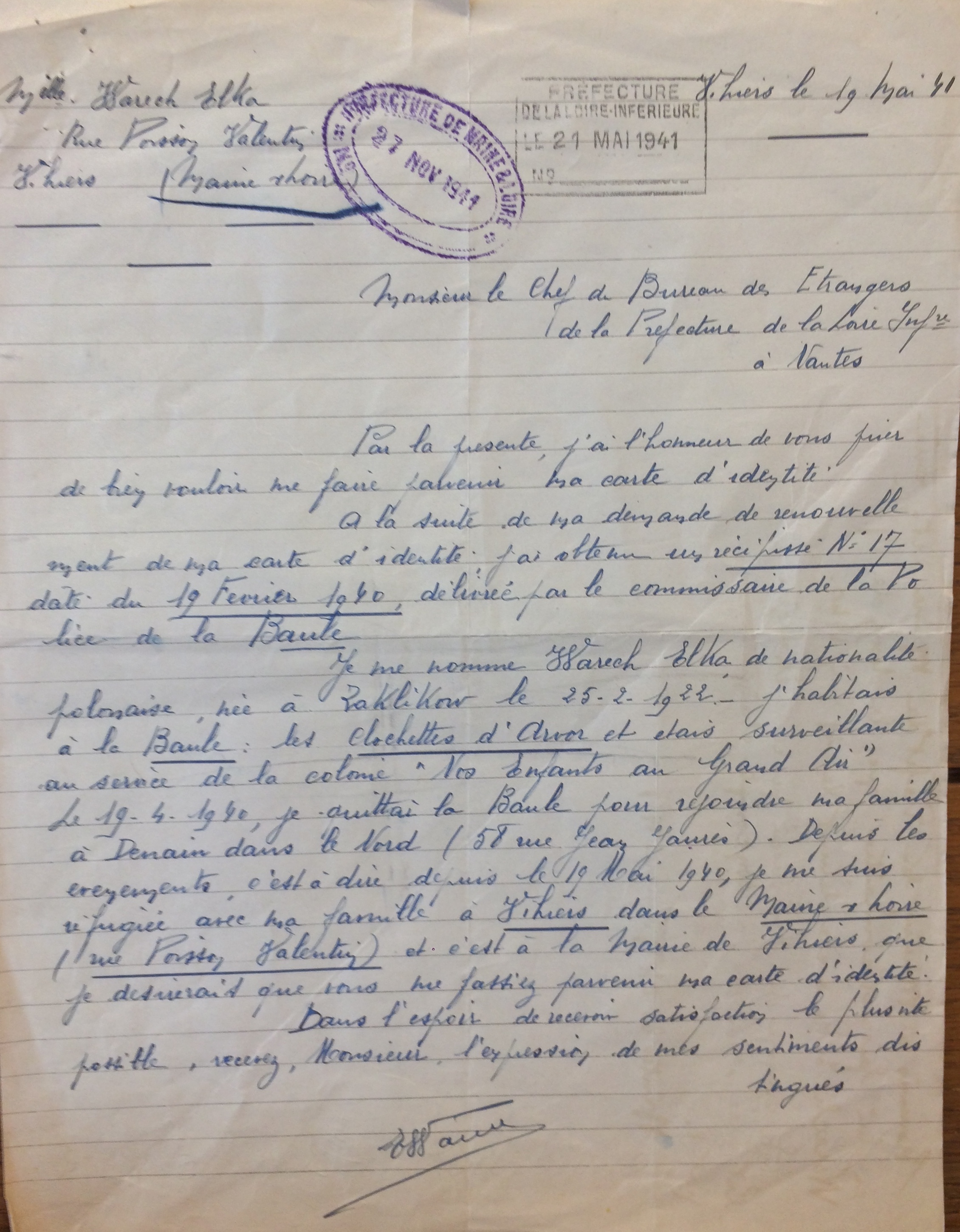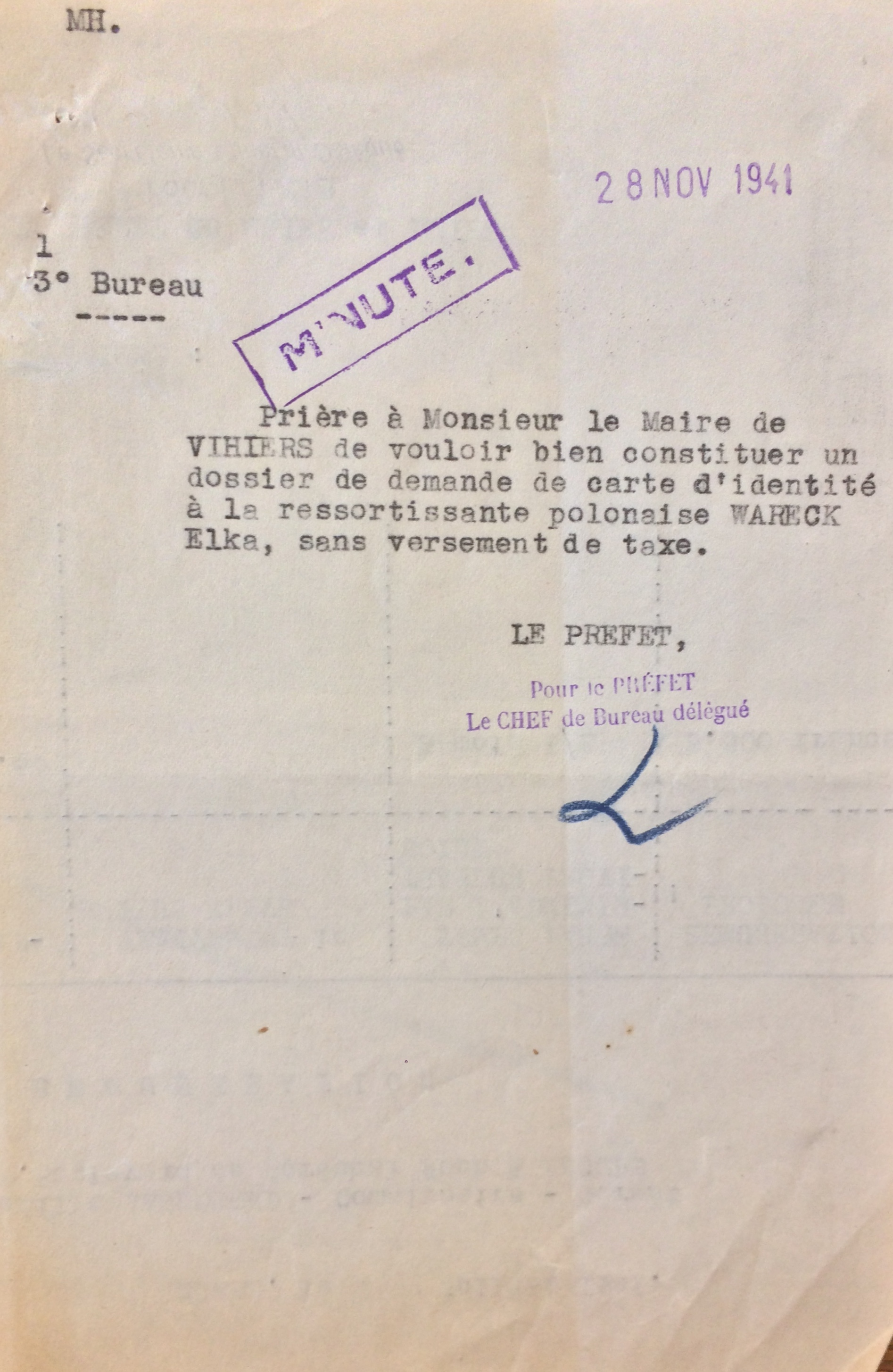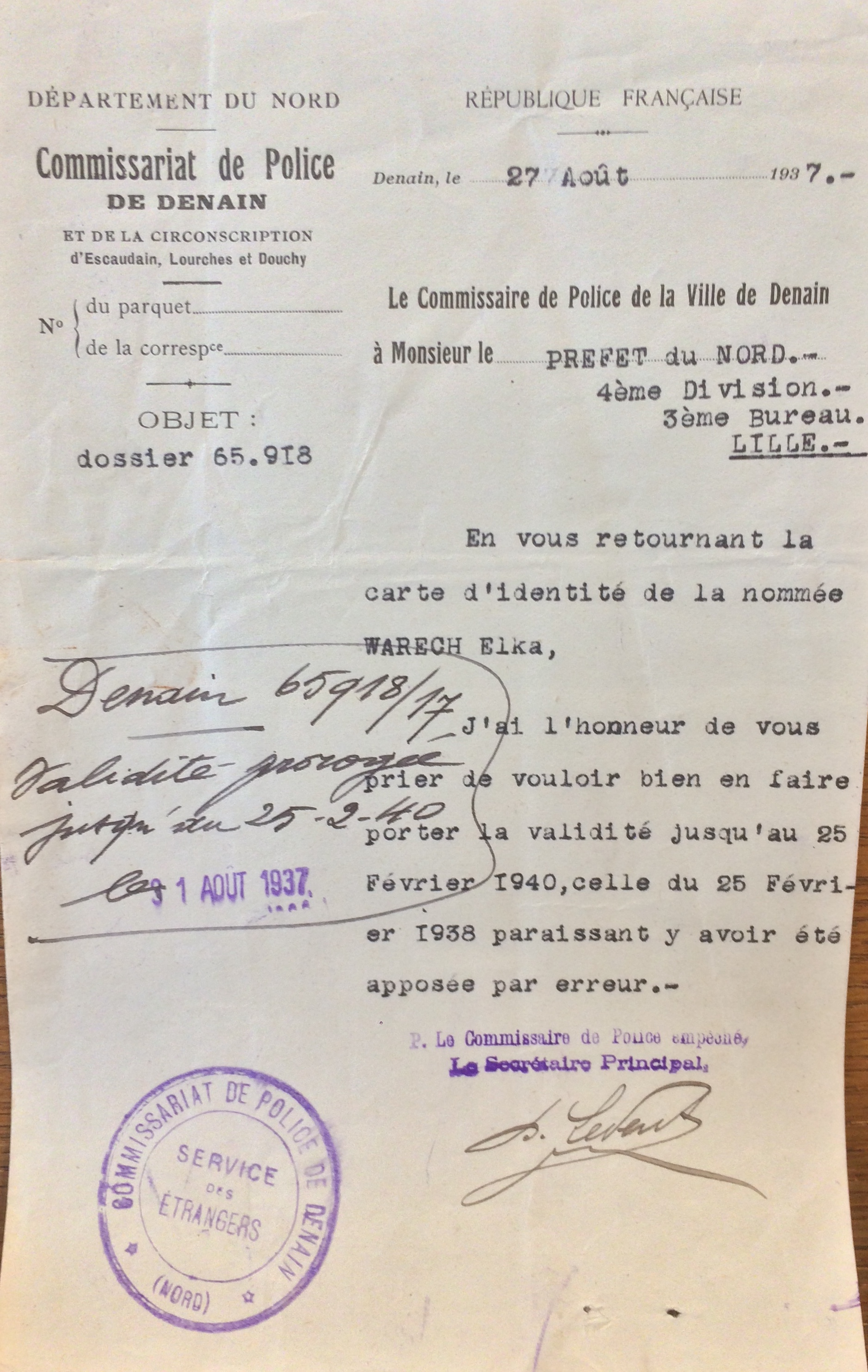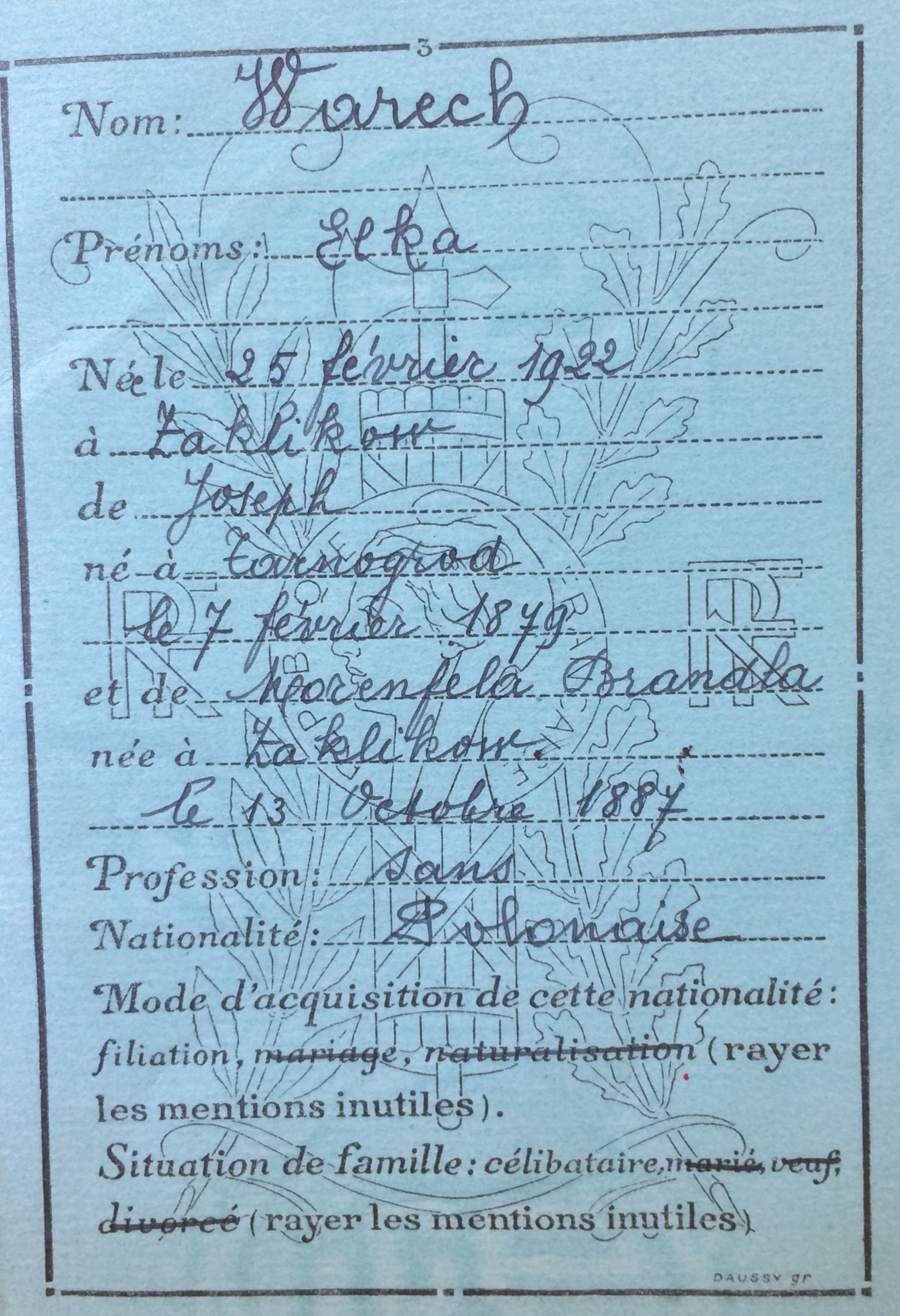 Elka WARECH est née le 25 février 1922 à Zaklikow (Pologne). [Père : Joseph WARECH et Mère : MORENFELD Brendla]. La famille est arrivée en France le 19 septembre 1925 et réside dans le département du Nord à Denain au 58 rue Jean Jaurès.