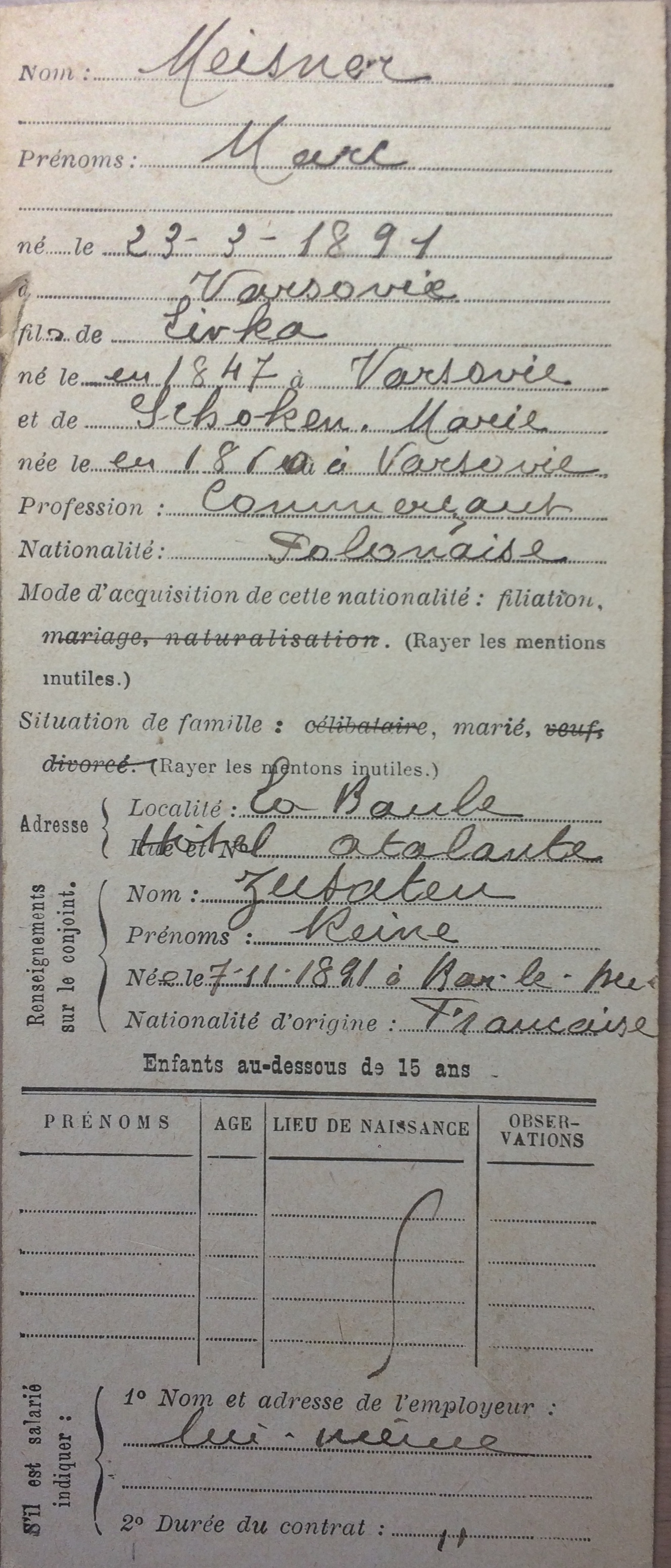 Marc MEISNER (Mordka MAIZNER dit MEISNER) est né le 23 mars 1891 à Varsovie (Pologne) [Père : Lévoka MAIZNER et Mère : SCHOKEN Marie] et la famille est arrivée en 1901 en France. Il est marié avec Reine ZEIGEISEN [Père : Chaïm Abraham et Mère : Hélène CHAÏM] née le 07 novembre 1898 à Bar-le-Duc (Meuse) depuis le 21 octobre 1922 (Paris, 9ème arrondissement).