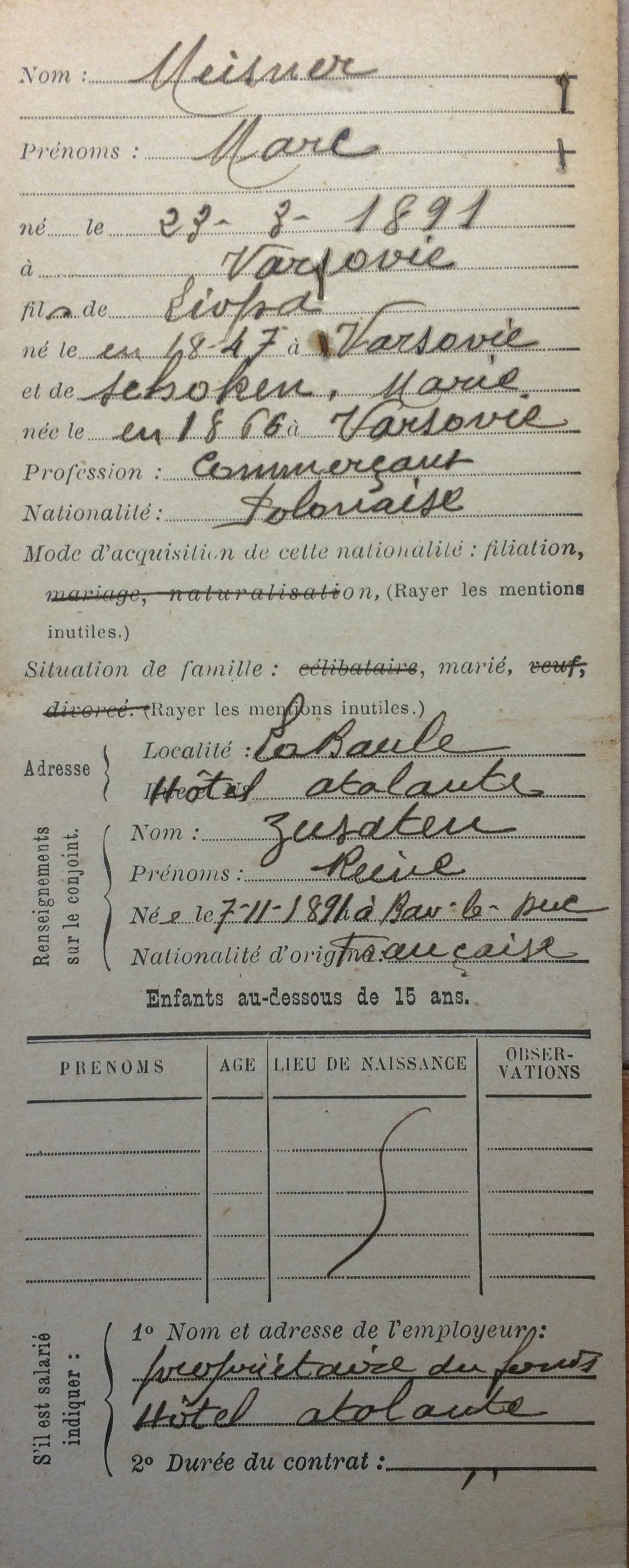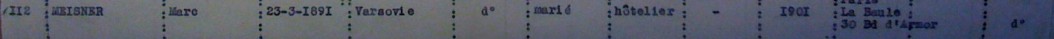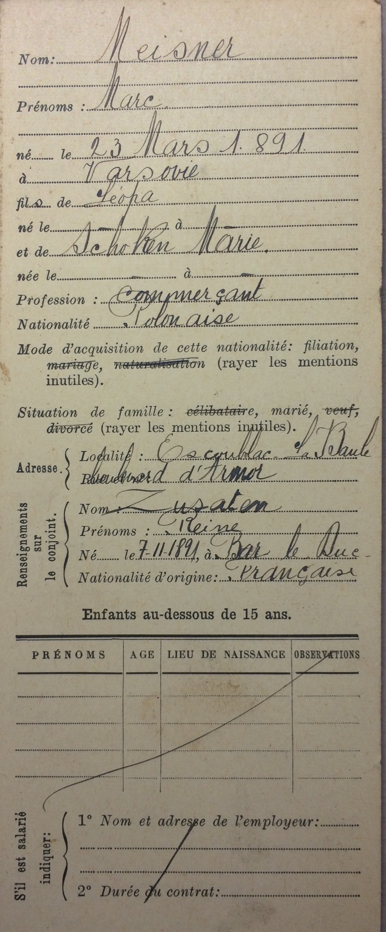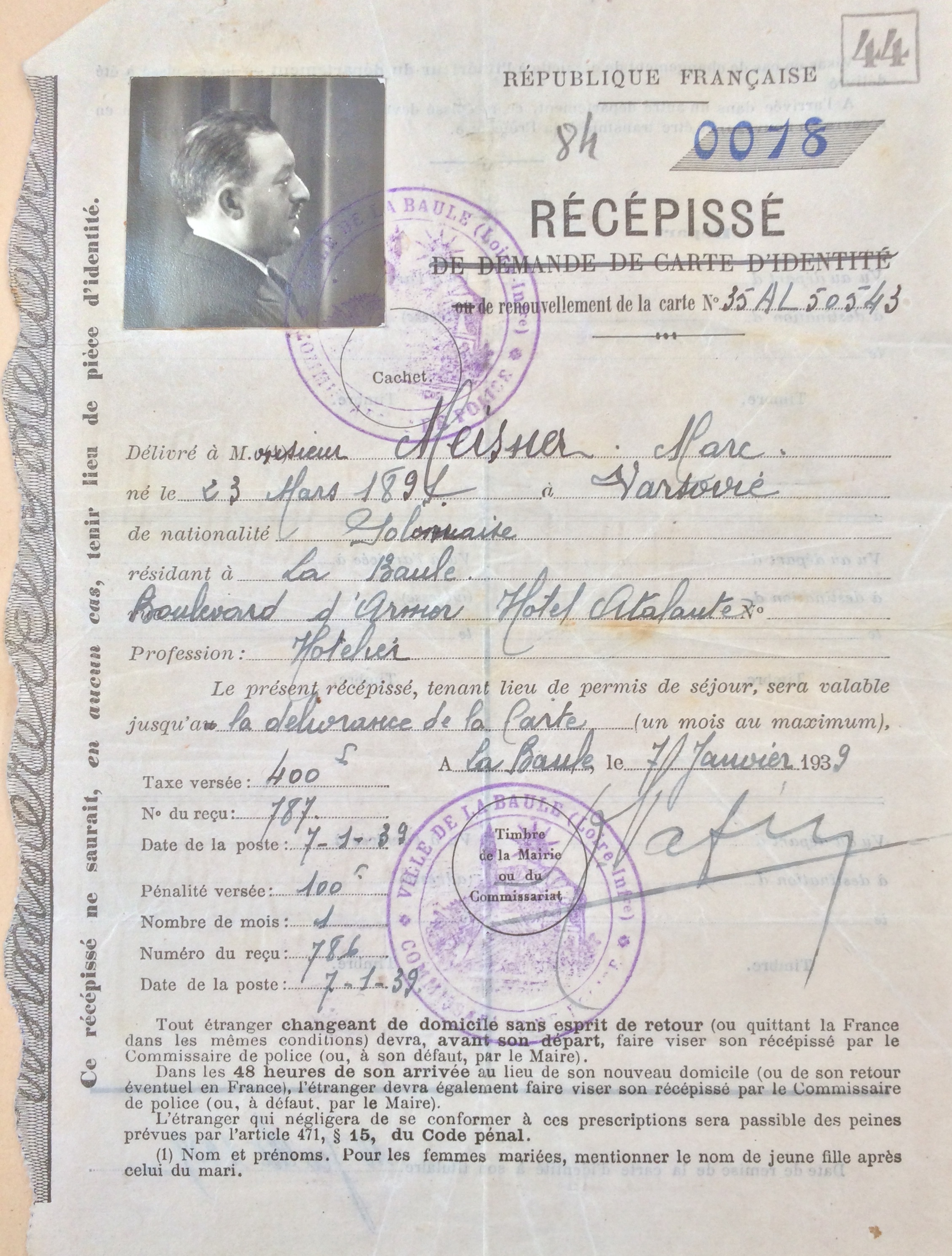 Entre le 27 septembre et le 20 octobre 1940, Marc MEISNER se déclare en tant que Juif à la sous-préfecture de Saint-Nazaire (ou commissariat de la Baule) sous le numéro 112.