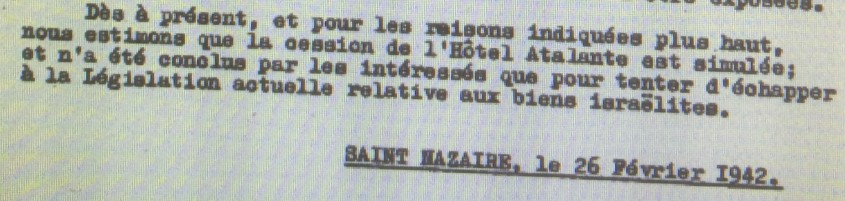 En novembre 1941, le Commissariat Général aux Questions Juives est informé (sic) que l’Hôtel Atalante est toujours en activité et demande à ce que le Préfet de Loire-Inférieure fasse le nécessaire pour aryaniser le commerce et nommer un administrateur provisoire. Ce qu’il ne tarde pas à faire puisque le 16 janvier 1942, Gabriel HERVOUËT, arbitre de commerce à Saint-Nazaire est nommé administrateur provisoire de l’hôtel.