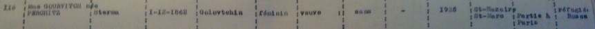 Sterma GOURVITCH née PERCHITZ est née le 01 décembre 1862 à Golovtchin (Biélorussie) et est arrivée en France en 1925. Veuve, elle se fait recenser en même temps qu’Esther RAPPAPORT. Ce sont des femmes âgées, d’origine russe et elles habitent à Saint-Marc, comme Ludmilla SCHATZ, elle-même d’origine russe.