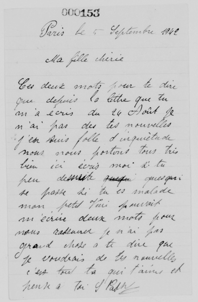 Vous vous étonnez d’être sans nouvelles de nous. C’est simplement que nous croyions toujours n’avoir pas le droit de vous écrire. Sinon vous en auriez eu souvent. Autrement j’écris à Paris chaque semaine et la réponse m’arrive quelques jours plus tard.