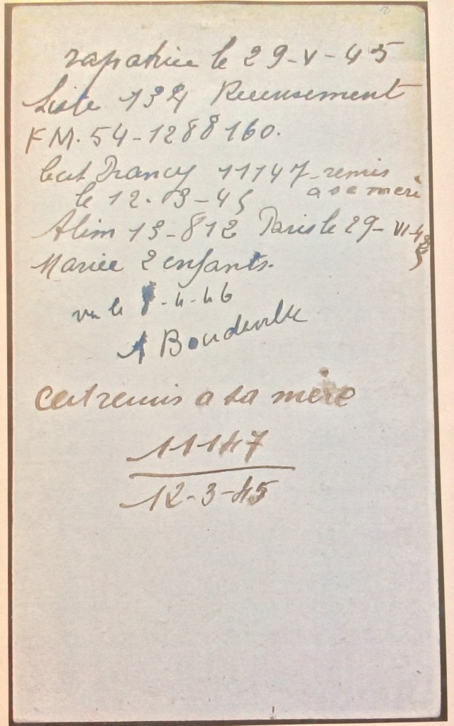Ils sont dirigés vers l’Hôtel Lutetia à Paris, hôtel réquisitionné pour l’accueil des déportés au retour. Les fiches verso de Drancy vont être utilisées à l’Hôtel Lutetia en particulier pour remettre des certificats de déportation aux familles. Le 12 mars 1945, Sarah PASSY, la mère de Jeanne et la grand-mère de Victor, se déplace à l’Hôtel Lutetia sans nouvelles de sa famille où un certificat de déportation lui est remis.