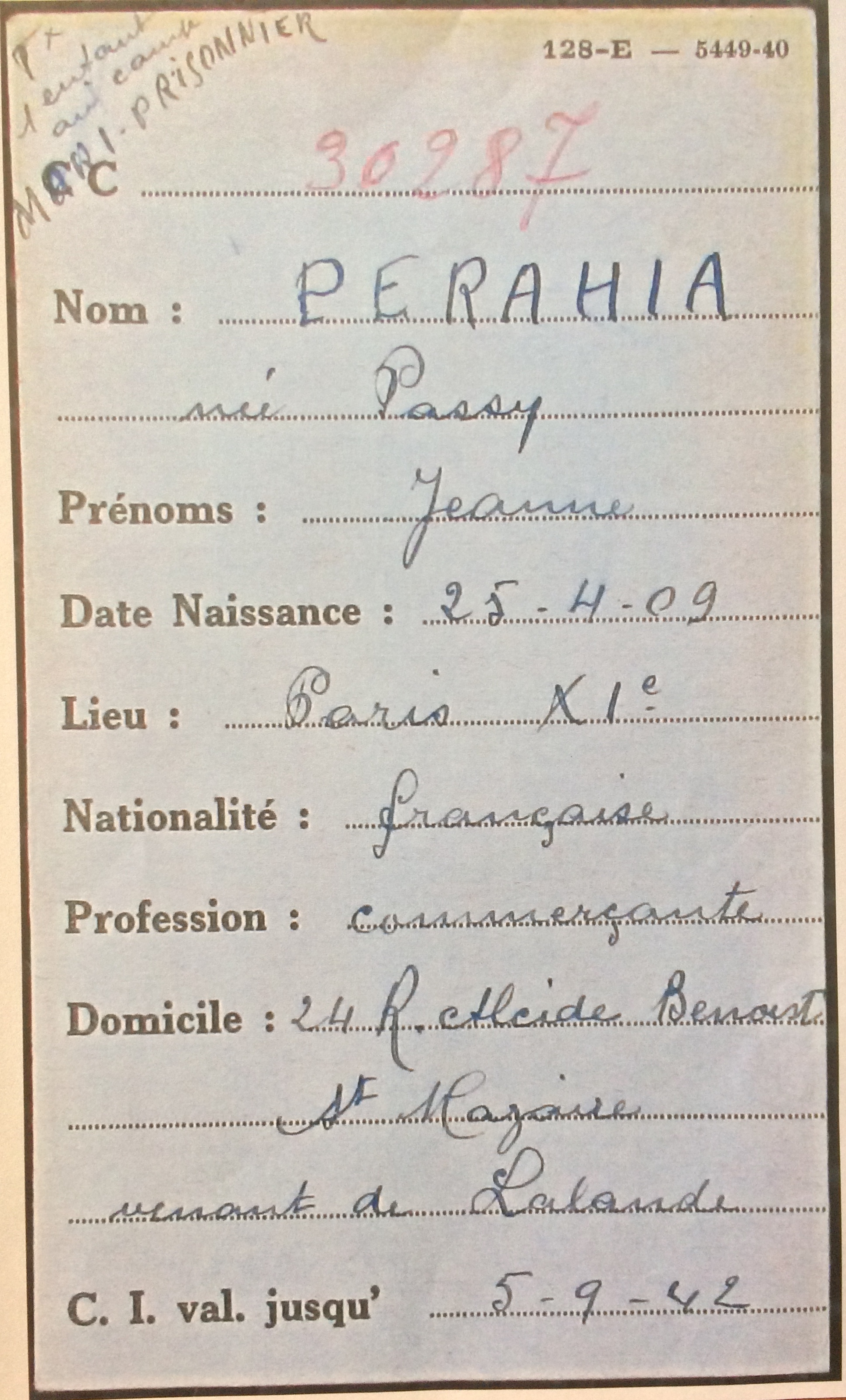 Caleve Robert PERAHIA (prénom usuel Robert) est né le 20 avril 1901 à Constantinople (Turquie) [Père : Haïm PERAHIA né en 1877 à Constantinople et Mère : Diamante GUAKIL née en 1881 à Constantinople]. Robert arrive en 1921 en France avec au mois un de ses frères lui aussi arrivé en 1921 [Albert né en 1903 à Constantinople]. Robert se rend régulièrement au Café-Restaurant « Le Bosphore » au 74 rue Sedaine à Paris dans le 11ème arrondissement, lieu de rendez-vous pour les juifs séfarades turques qui leur permet à la fois de trouver un logement et des pistes pour un travail et qui est également un lieu de sociabilité. Ce restaurant ouvert en 1905 était en outre le lieu de cérémonies juives (Bar Mitzvah, mariages…) avant la création de la synagogue de la rue Popincourt (1909). Salomon PASSY est le propriétaire du fonds de commerce depuis 1913 et il a une fille prénommée Jeanne (née le 28 avril 1909 à Paris 11ème arrondissement). Au moment de la naissance de Jeanne, Sarah, sa mère est couturière. C’est dans ce restaurant que Robert va rencontrer Jeanne et le couple se marie le 27 juin 1929 à Paris (2ème arrondissement). Robert habitait alors au 96, rue d’Aboukir tandis que la famille PASSY habitait au 121 de la même rue.
