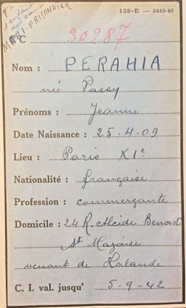 Fiches d’internement de Jeanne PERAHIA Camp de Drancy [Archives Nationales F9/5746]