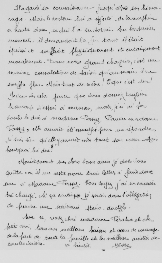 Sur ce, recevez chère madame Pérahia et cher petit ami, tous mes meilleurs baisers et vœux de courage de la part de toute la famille et les meilleures amitiés de tous les voisins.